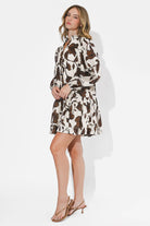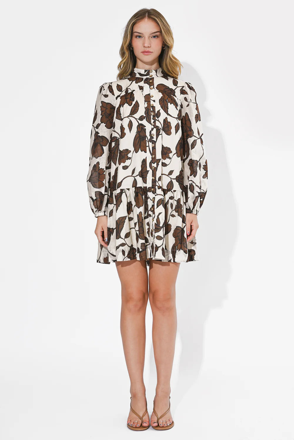 This cotton mini dress showcases an earthy floral print in rich chocolate brown tones against a creamy backdrop—perfect for year-round wear. The relaxed silhouette features a button-front design, long blouson sleeves with elastic cuffs, and a tiered skirt that creates effortless movement. A subtle stand collar and gathered yoke details add a refined touch to its breezy, feminine feel. Lightweight and breathable for spring and summer, it also transitions beautifully into cooler months—just add tights, tall boots, and a cozy cardigan or jacket for a chic fall-to-winter look. This dress offers a versatile aesthetic, bridging the gap between smart casual and semi-dressy events, especially suitable for daytime and work settings. Perfect for brunches, luncheons, or weekend outings through any season.