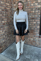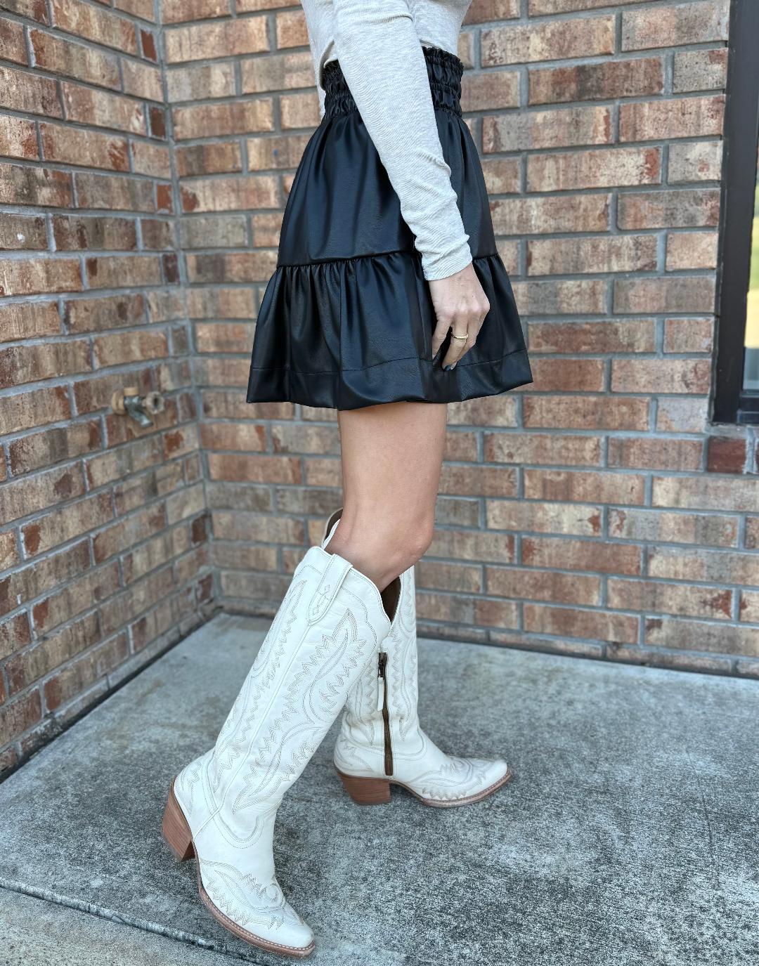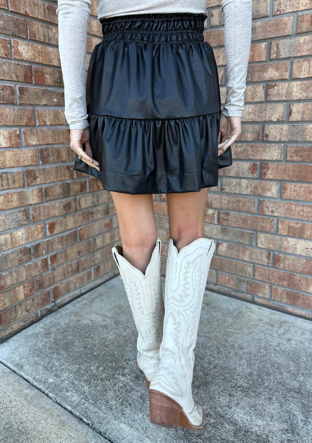 ThisTiered Leather Mini Skirt is the perfect mix of edgy and feminine. Crafted from supple vegan leather, it features a flirty tiered silhouette with soft gathers that create beautiful movement and texture. The wide smocked waistband provides a comfortable, flattering fit that defines the waist while keeping the look effortless. Versatile and chic, this skirt pairs perfectly with our Lira Top and tall western boots for a stylish fall outfit, or dress it up with a sequin top and heels for a night out. A standout piece that adds instant attitude and polish to any wardrobe.
