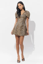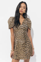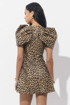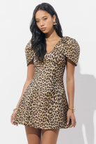 Make a bold statement in this jacquard leopard mini dress. CrafVted from a structured jacquard fabric that holds its shape beautifully, it features dramatic puff cap-style sleeves, a flattering V-neckline, and a fitted bodice that flares into a playful A-line skirt. The textured leopard print adds a luxe, eye-catching finish, making this dress perfect for nights out, special events, or anytime you want to turn heads. Pair it with sleek heels and gold accessories for an effortlessly fierce look.