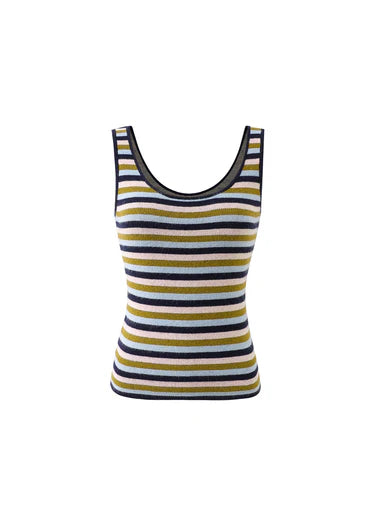 This striped sweater tank is crafted from a soft, tightly woven knit that feels smooth and refined against the skin. The fitted silhouette and scoop neckline create a flattering shape, while the mix of navy, olive, blue and blush stripes gives it a playful yet polished look. Lightweight with stretch, it’s perfect for layering under jackets or pairing with the matching cardigan