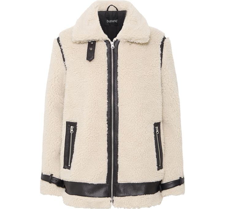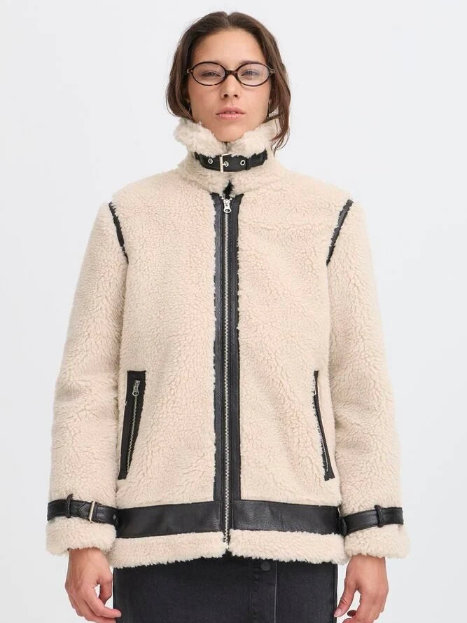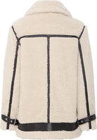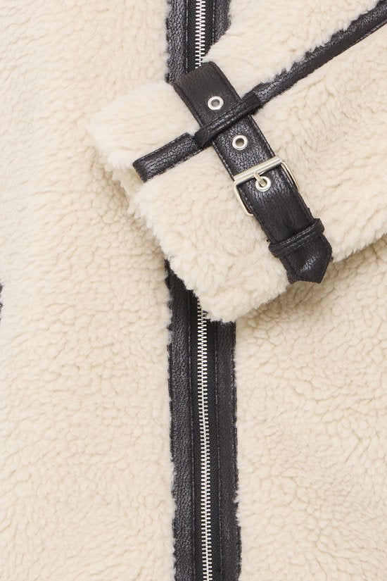 This shearling jacket delivers the perfect mix of warmth and edge. Designed in a cozy cream faux-shearling fabric, it’s detailed with bold black faux-leather trim and zipper accents that give it a modern moto-inspired twist. The high buckle collar adds both function and flair, keeping you snug while elevating the silhouette. Finished with zip pockets, adjustable buckle cuffs, and contrast paneling throughout, this jacket pairs effortlessly with denim or dresses for an ultra-chic, cold-weather statement look.