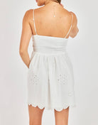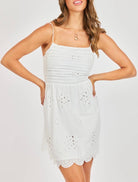 A soft, feminine mini dress designed with delicate eyelet detailing throughout. This lightweight style features a straight neckline with adjustable spaghetti straps and a fitted bodice accented by subtle pintuck pleating and small cutout embroidery for added texture. The smocked back provides a comfortable, flexible fit, while the flowy skirt falls effortlessly with scattered eyelet patterns and a scalloped hem for a sweet, airy finish. Fully lined for easy wear, this piece is perfect for warm days, bridal moments, or anything that calls for an effortlessly pretty look.