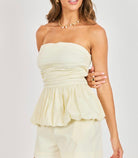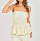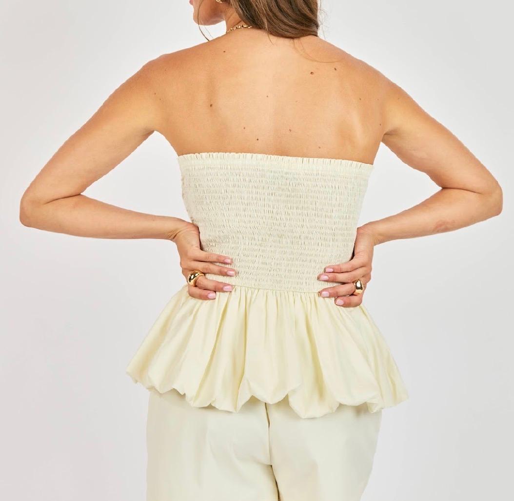 This strapless bubble top is the perfect mix of soft structure and feminine drama. Designed in a creamy neutral hue, it features a ruched bodice that hugs comfortably through the torso, creating a flattering, sculpted fit. The back is fully smocked for stretch and support, ensuring it stays in place while still feeling easy to wear. At the waist, the silhouette flares into a voluminous bubble hem that adds playful dimension and a modern statement shape. Lightweight yet eye-catching, this top pairs beautifully with tailored trousers, denim, a skirt or we love it with our Love Language Woven Shorts. Wear for everything from summer events to elevated everyday styling.