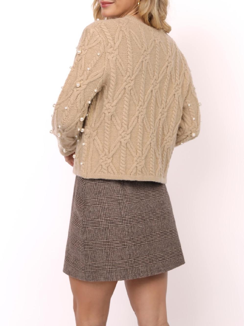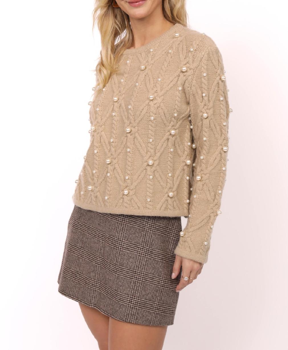 This pearl embellished sweater is a chic twist on a cozy classic. Designed in a warm beige tone, it features a chunky cable-knit pattern that brings rich texture and dimension. What sets this sweater apart is the scattered pearl embellishments that trace along the knit, adding a feminine and elegant touch to the otherwise casual silhouette. With a relaxed fit, round neckline, and long sleeves, it balances comfort with sophistication, making it an effortless piece to dress up or down. Perfect with jeans for an elevated everyday look or paired with a tailored skirt for a polished outfit, this sweater is where cozy meets glamorous.