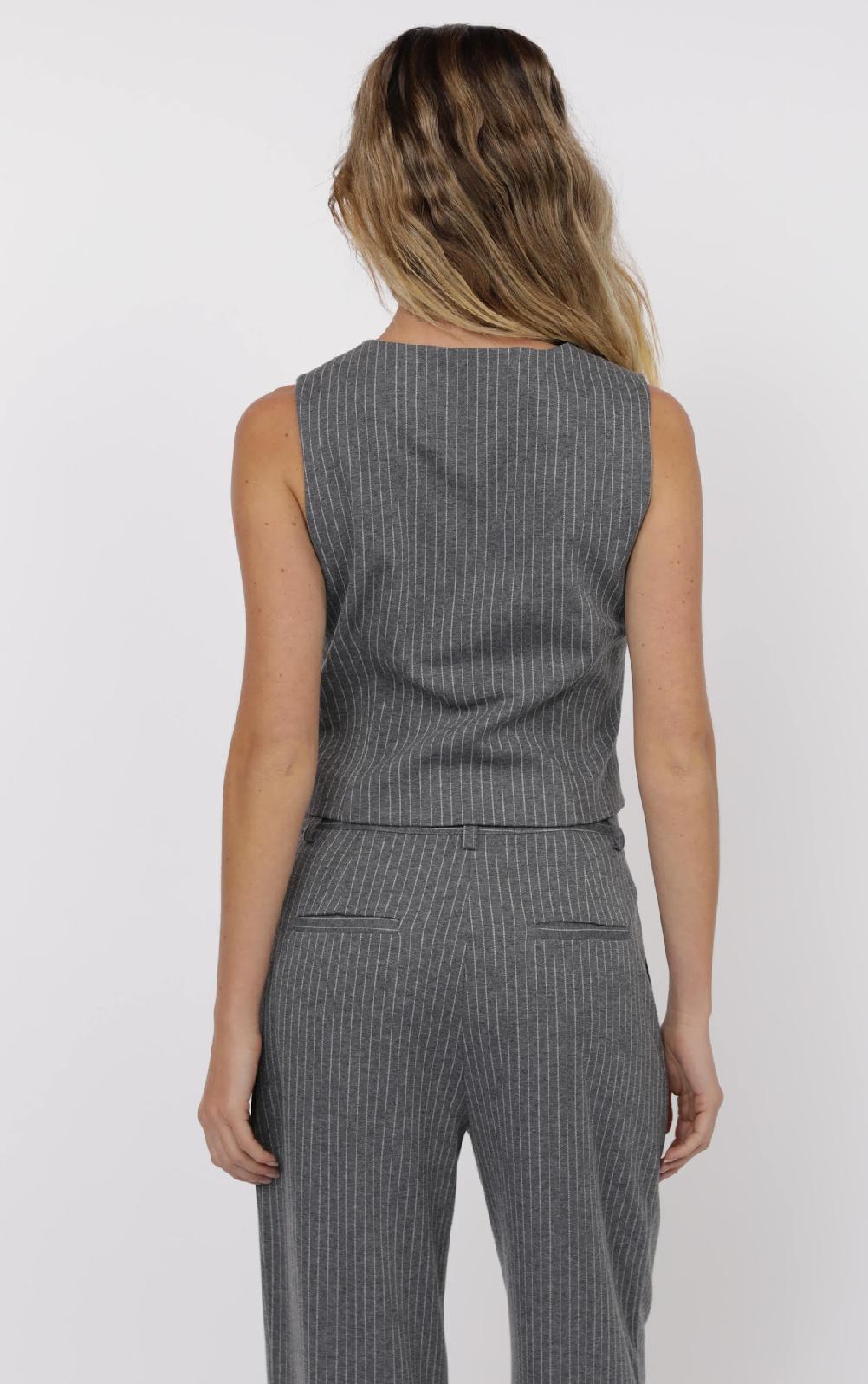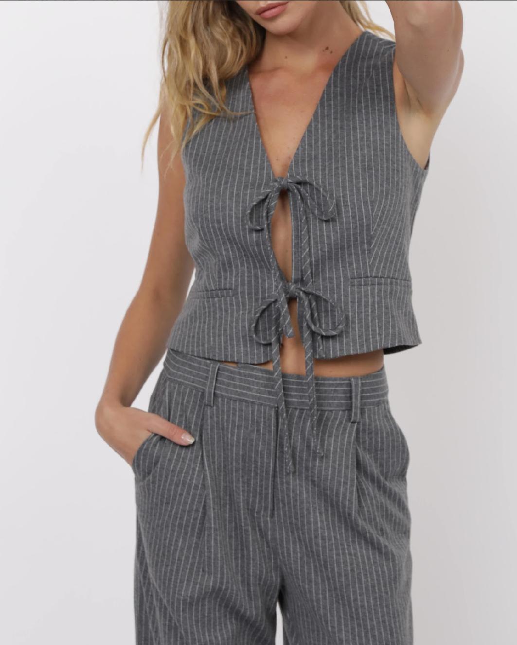 The Day to Day pinstripe front tie vest top brings a playful yet chic element to the matching pant. Designed with a sleeveless cut and a V-neckline, it features two front ties that create a flattering, feminine finish. This piece works beautifully on its own for a fashion-forward look, but it also layers perfectly over a simple cami, a crisp collared shirt, or even a fitted knit top for cooler days. Styled together with the pants, the vest top creates a sleek coordinated set, but it’s equally striking when mixed with denim or our Night Vision leather pant for a more casual vibe.