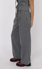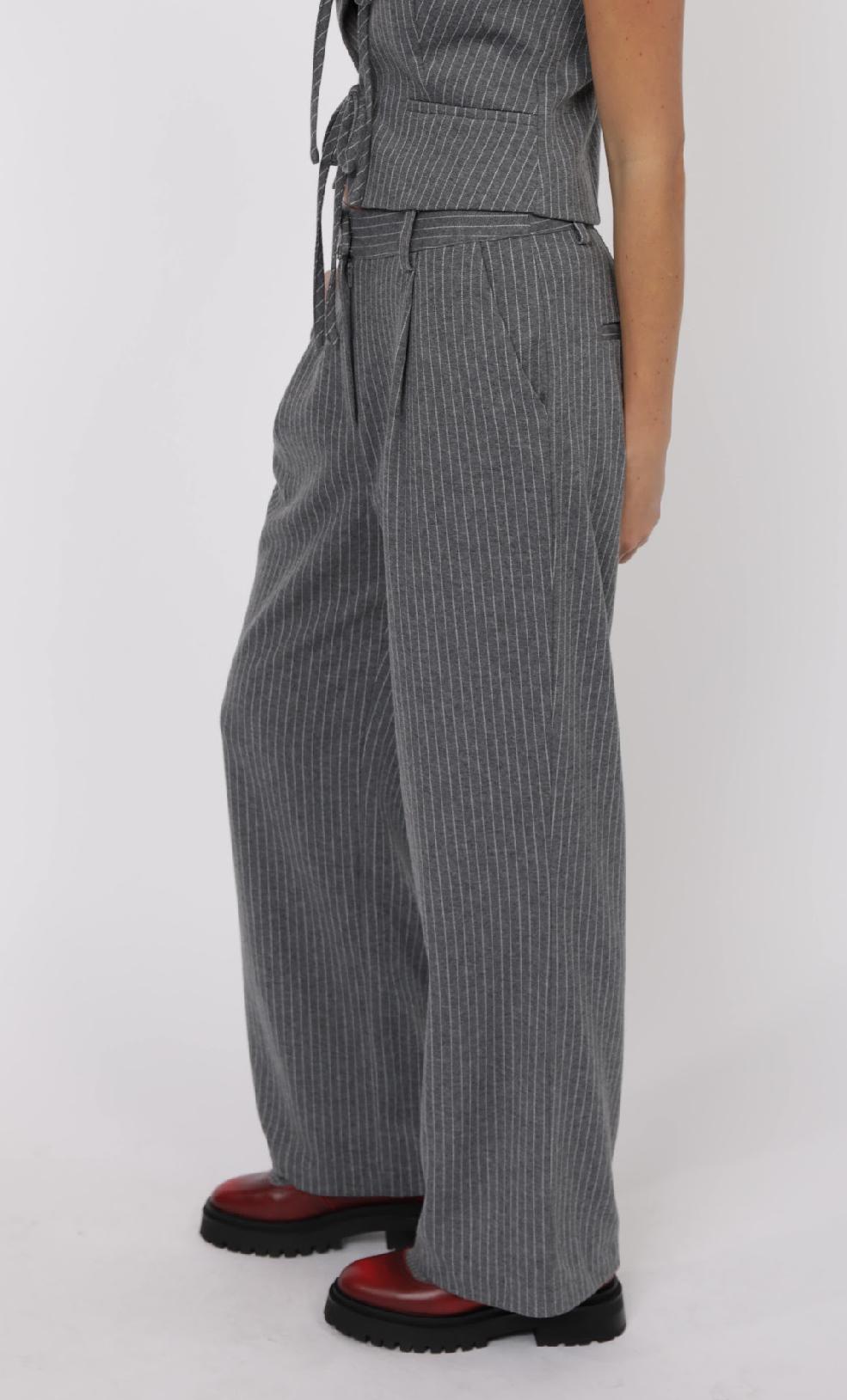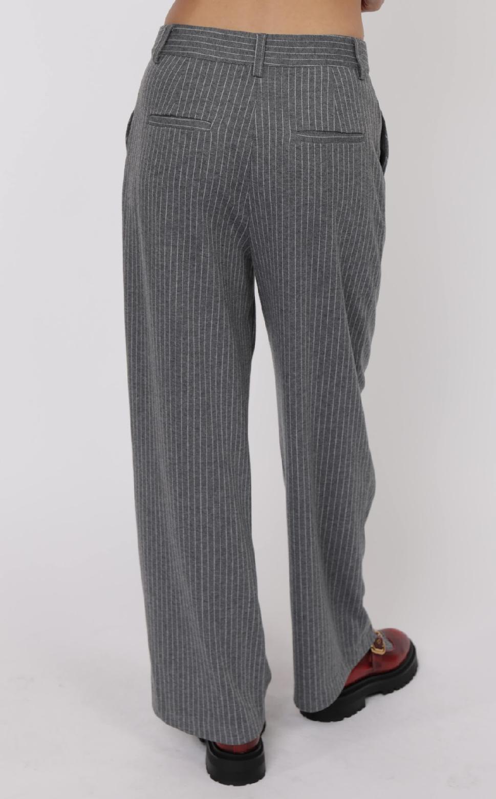 The Day to Day Pinstripe Pant is a tailored, wide-leg trouser designed in a soft gray with fine white pinstripes that give it a sharp, modern edge. With belt loops, a zip closure, side pockets, and welted back pockets, it blends structure with comfort, making it versatile for both casual and polished looks. Its relaxed yet refined fit makes it easy to pair with everything from sneakers to loafers or heels, depending on the occasion. Style with the matching vest top or any top in a bold pop of color.