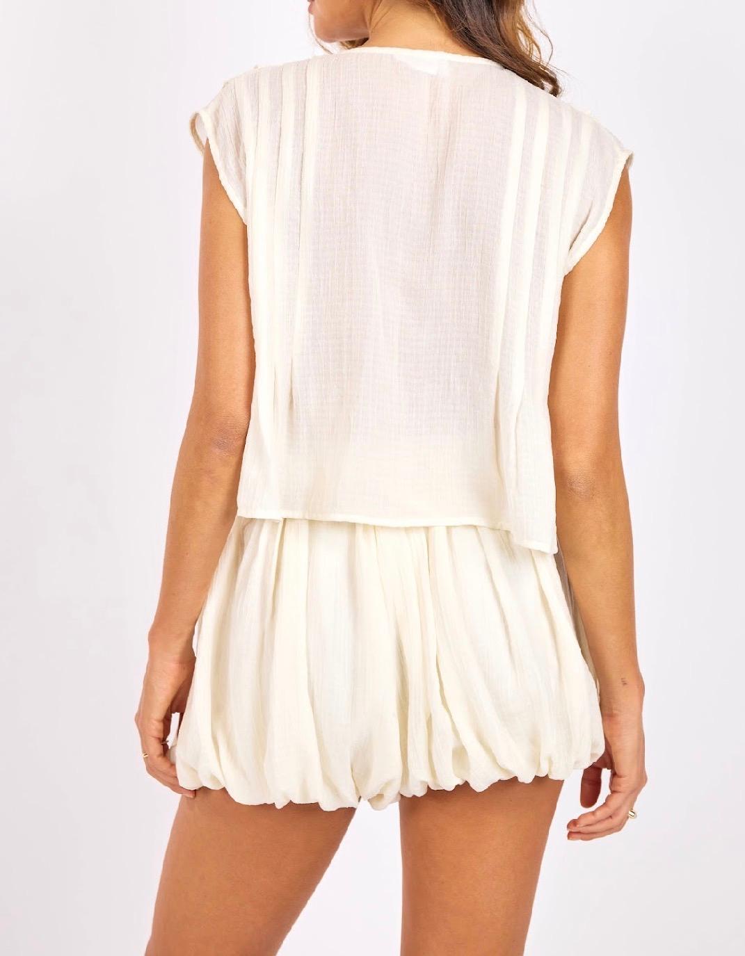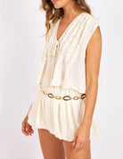 Lightweight and airy, this dreamy blouse brings all the soft bohemian vibes. Designed with a relaxed, flowy silhouette, it features a flattering V-neckline with delicate tie-front detail and cascading ruffle accents along the front for added texture and movement. The silky/gauzy, semi-sheer fabric gives it that effortless, lived-in feel, while the loose fit makes it perfect for layering or wearing as-is for an easy, romantic look. Style with denim or the matching bubble shorts. Boho, feminine, and effortlessly pretty.