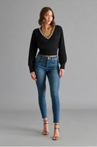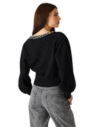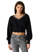 This black cropped sweater brings elevated detail to a cozy silhouette. Designed with a soft knit texture and relaxed fit, it features a flattering V-neckline embellished with jeweled accents that add just the right amount of sparkle. The balloon sleeves and wide ribbed hem balance structure with ease, creating a feminine yet modern shape. Perfect for dressing up denim or pairing with a Chablis Satin Skirt, it’s a standout piece that blends comfort with understated glamour.