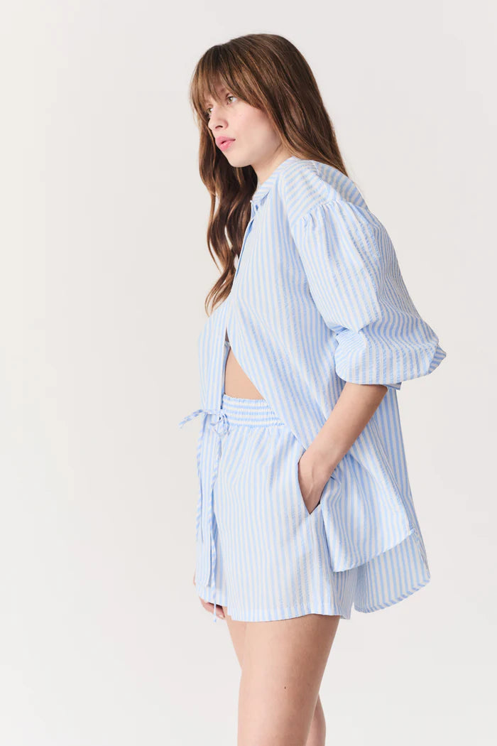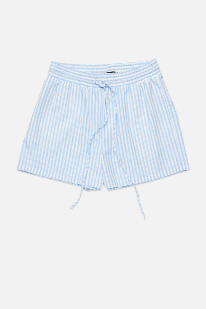 Seersucker light blue and white striped shorts with an elasticized waistband and drawstrings. For the ultimate "cool girl" look, style these shorts with the matching Fontelo Shirt. Switch it up by styling it back to our Z Supply basic tees and tanks.