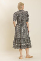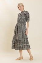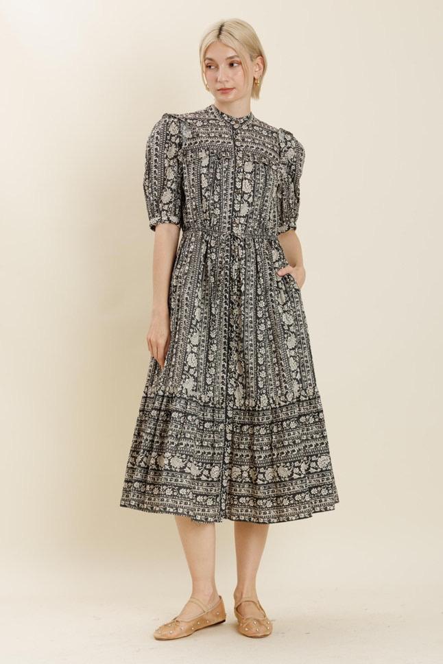 Feminine, flowy, and effortlessly timeless — this printed midi dress is the perfect blend of classic charm and modern ease. Featuring a delicate button-front closure and adjustable drawstring waist, it offers both structure and comfort. The puff sleeves and tiered skirt lend a soft, romantic silhouette, while the side pockets add a practical touch. Finished in a vintage-inspired floral print that feels right for every season - style with boots, sandals or sneakers.