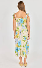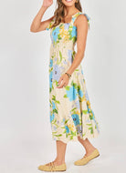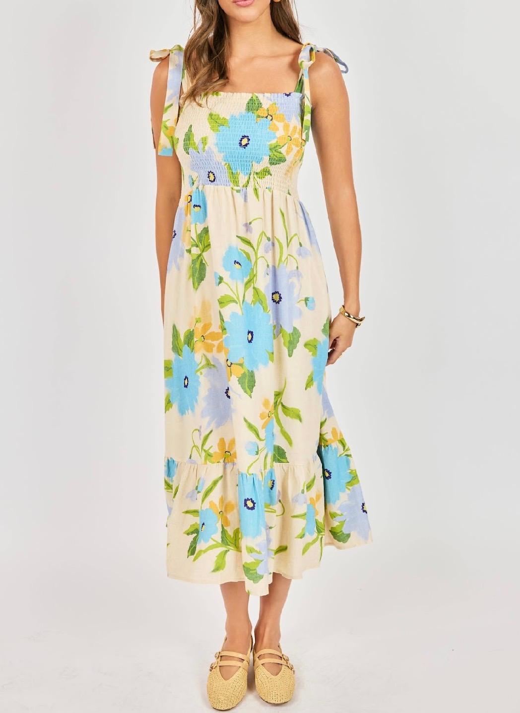 This floral midi dress is effortlessly feminine with a fresh, romantic feel. Designed in a soft cream base with oversized blue and yellow blooms and vibrant green stems, it makes the prettiest statement for spring and summer. The smocked bodice offers a flattering, flexible fit while creating beautiful texture through the torso. Adjustable tie straps add a delicate detail (and allow for a customizable fit), while the square neckline keeps the silhouette clean and classic. The skirt flows into an easy midi length with a subtle ruffle tier at the hem for added movement and charm. Lightweight and breezy, this dress is perfect for brunch, showers, vacations, or everyday moments when you want to feel effortlessly put together. Pair with woven flats or a simple sandal for an easy, polished look.