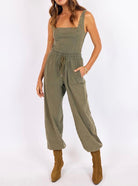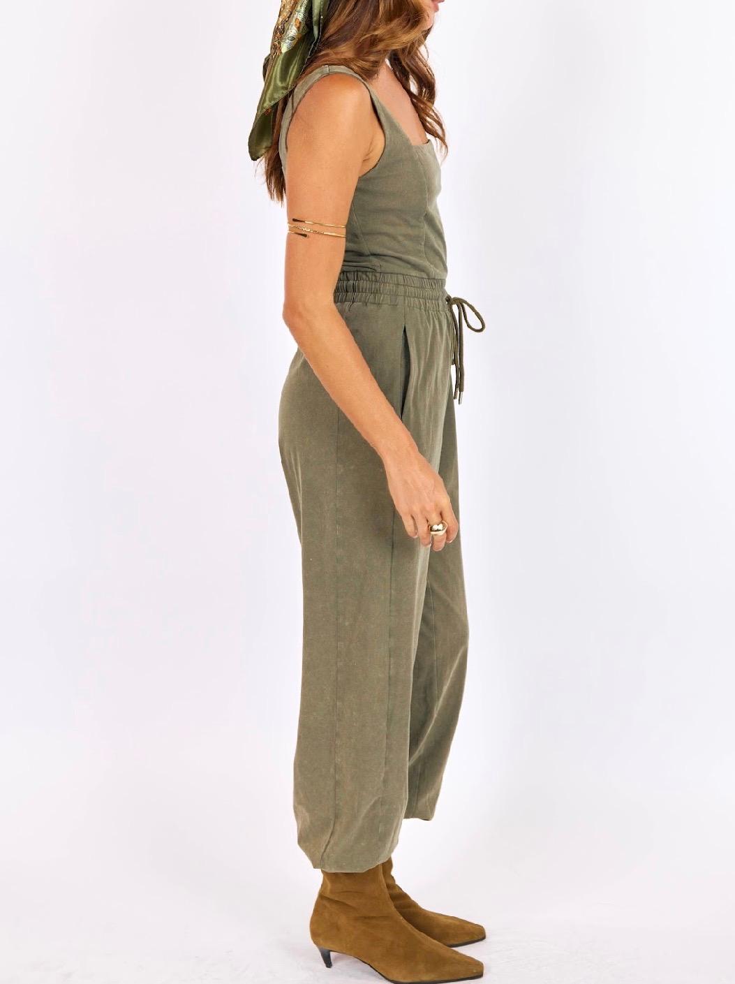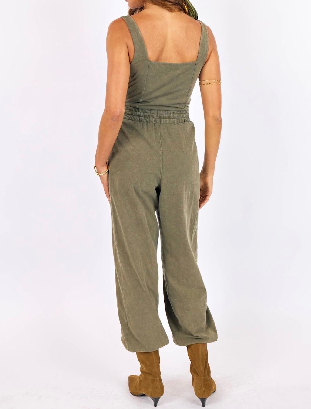 This mineral-washed olive jumpsuit is the definition of effortless, everyday cool. Designed in a soft, lived-in knit, it features a flattering square neckline with wide straps and a gently fitted bodice that flows into a relaxed silhouette. The elastic waistband with adjustable drawstring cinches comfortably at the waist for shape while keeping the fit easy and wearable. The jogger-style legs are finished with subtle elastic at the ankle, creating that slightly bloused effect that makes it perfect for styling. As shown, it pairs beautifully with suede booties for a more elevated, transitional look — but it’s just as easy to throw on with sandals or sneakers as the days get warmer. Finished with side pockets for that practical touch, this is a one-and-done piece you’ll reach for again and again.