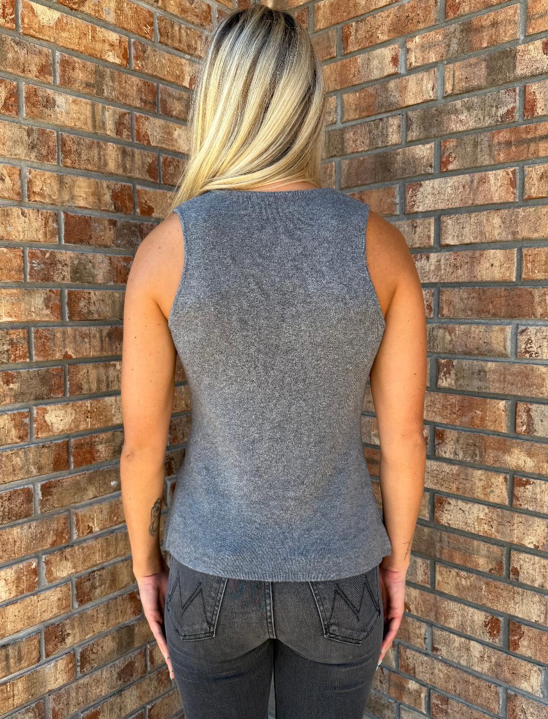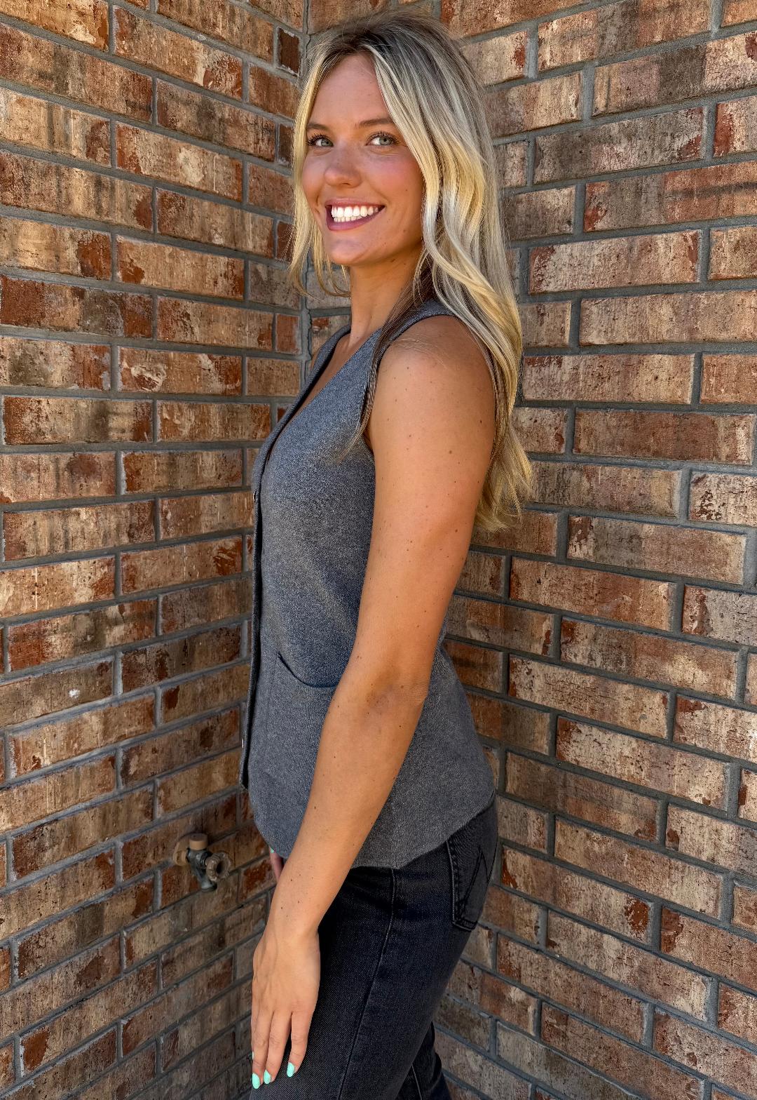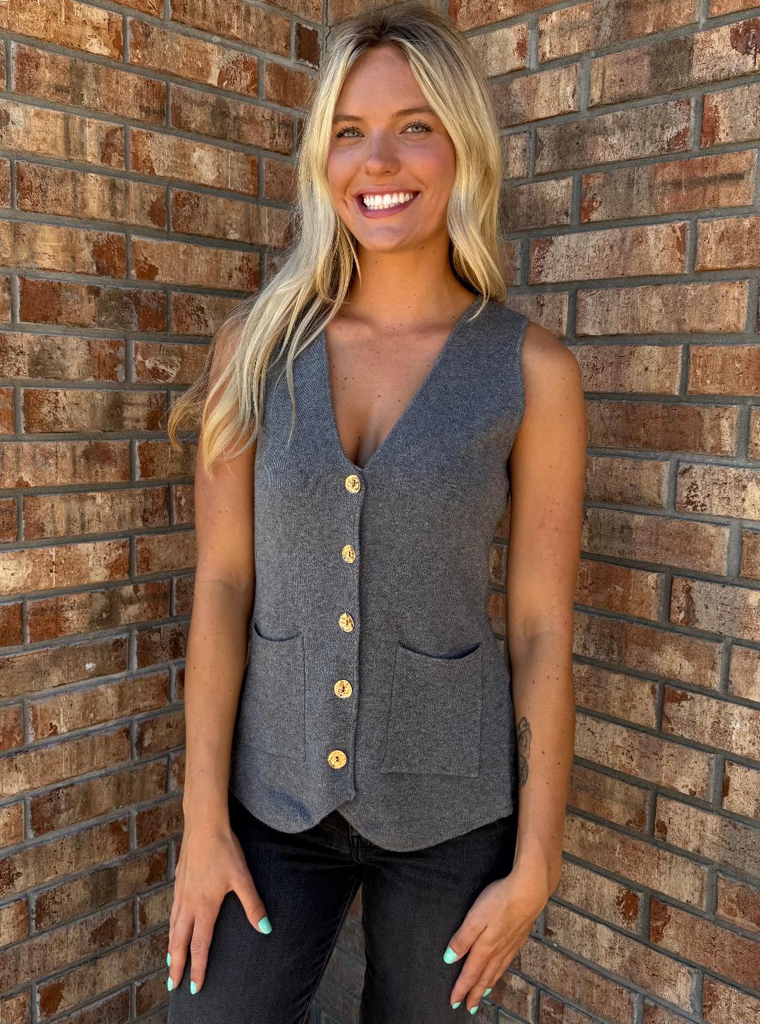 Cozy meets polished in this ultra-soft knit vest from DeLuc. Featuring a flattering v-neckline, gold button detailing, and functional front pockets, this heathered grey layer is perfect for transitional weather. The slightly tailored fit gives it a modern, feminine edge—wear it solo for a sleek statement or layer it over a crisp shirt or tee for added versatility. A luxe essential that brings comfort and class together effortlessly.