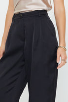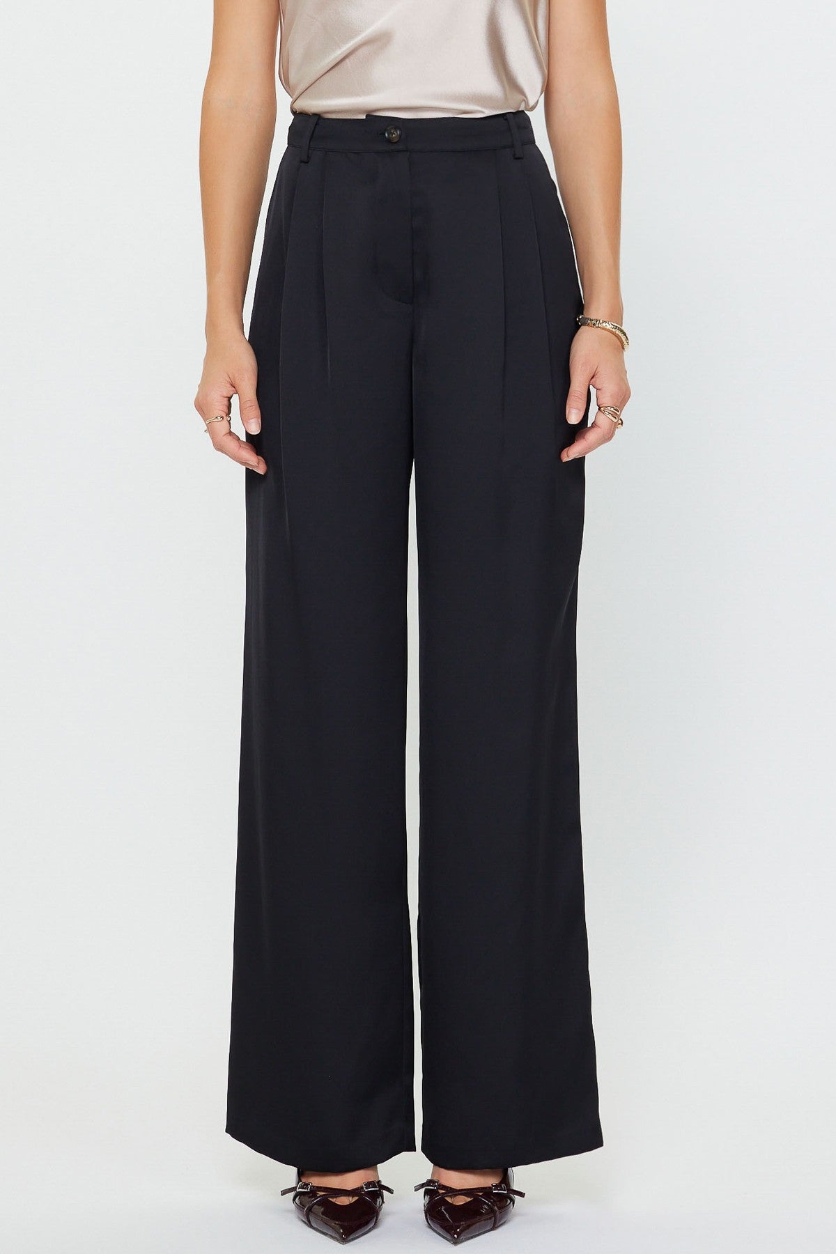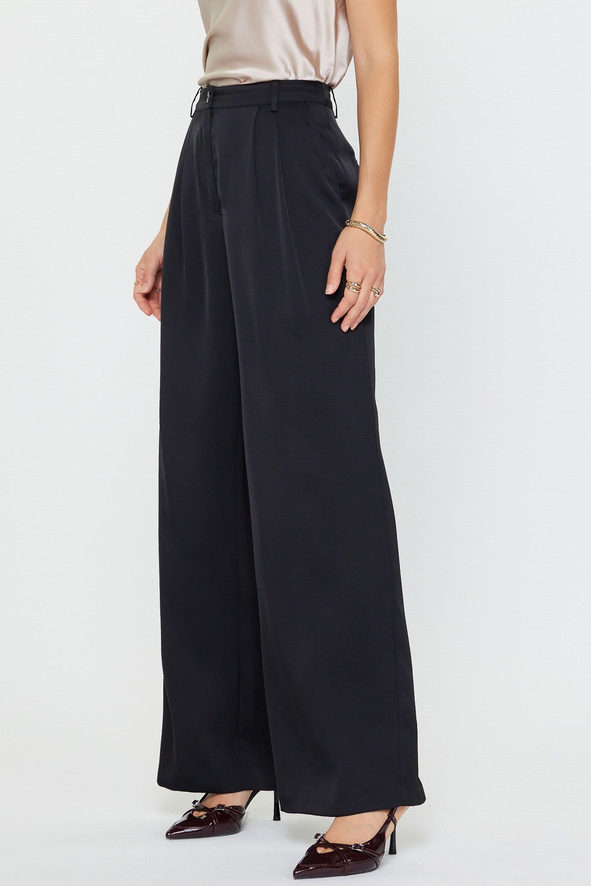 A contemporary take on a classic wide-leg silhouette, these silky trousers are designed with fluid drape and a soft sheen that feels luxe and modern. The pintuck detailing elongates the leg, while the high-rise waist and clean waistband add structure. Side pockets and back welt details finish the look. In hot pink, they pop with playful confidence; in black, they become an elegant wardrobe staple. Perfect for pairing with the matching blazer for a full power suit moment, or styling separately with a chic top for elevated versatility.