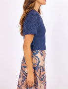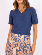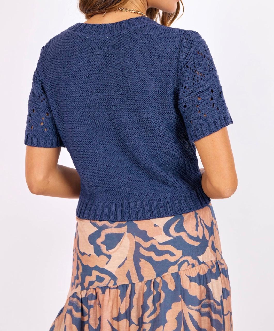 This short sleeve sweater is crafted from a lightweight nylon that feels soft and breathable with just enough structure to hold its shape. Designed with a classic V-neckline and a relaxed, easy fit, it features delicate pointelle detailing along the sleeves for a subtle touch of texture and femininity. Ribbed trim at the neckline, sleeves, and hem gives it a clean, finished look. Perfect for transitional seasons, it works beautifully on its own or layered under a jacket, pairing effortlessly with skirts or denim for an elevated everyday outfit. We love it as shown with our Wild City Maxi Skirt.