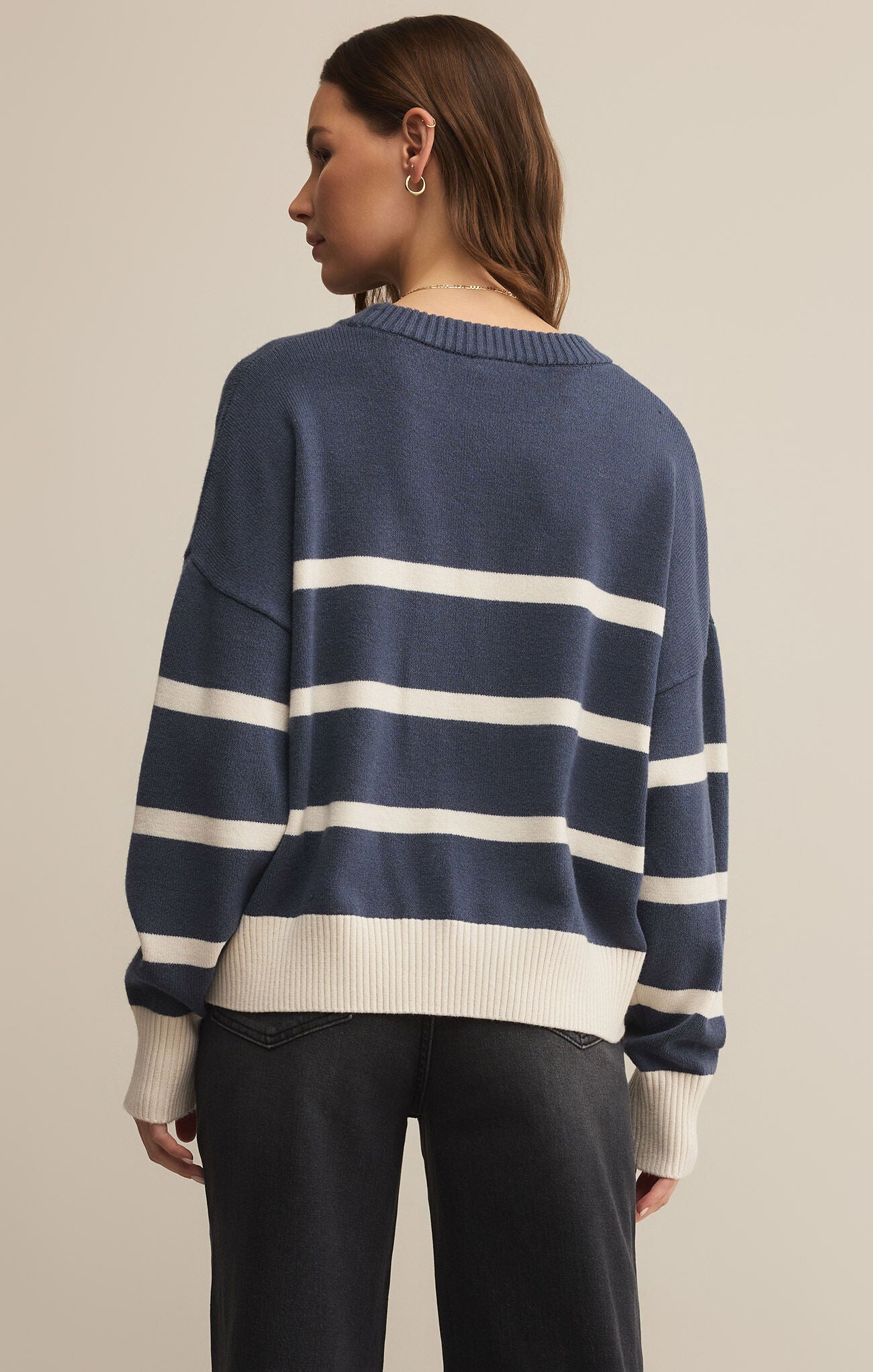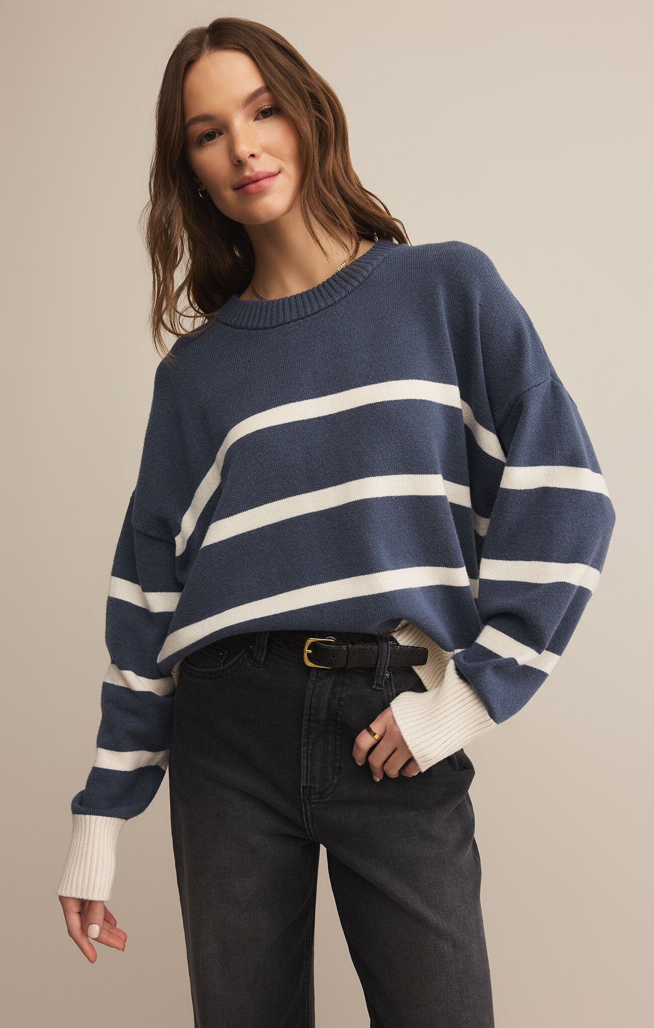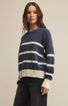 A relaxed and timeless knit you’ll want on repeat. It features a soft navy base with bold ivory horizontal stripes for a fresh, nautical-inspired look. The crew neckline and dropped shoulders enhance its laid-back vibe, while the long ribbed cuffs and hemline add structure and polish. Designed with a slightly oversized fit, it drapes effortlessly and pairs perfectly with denim or casual trousers for that effortless, everyday style. Super soft!