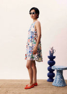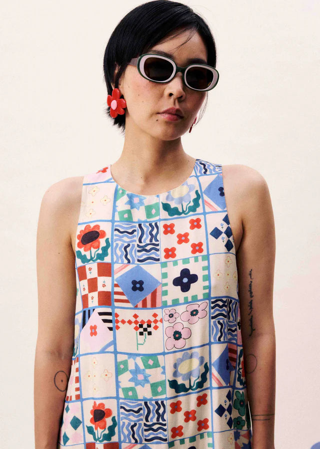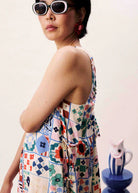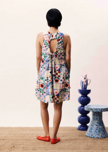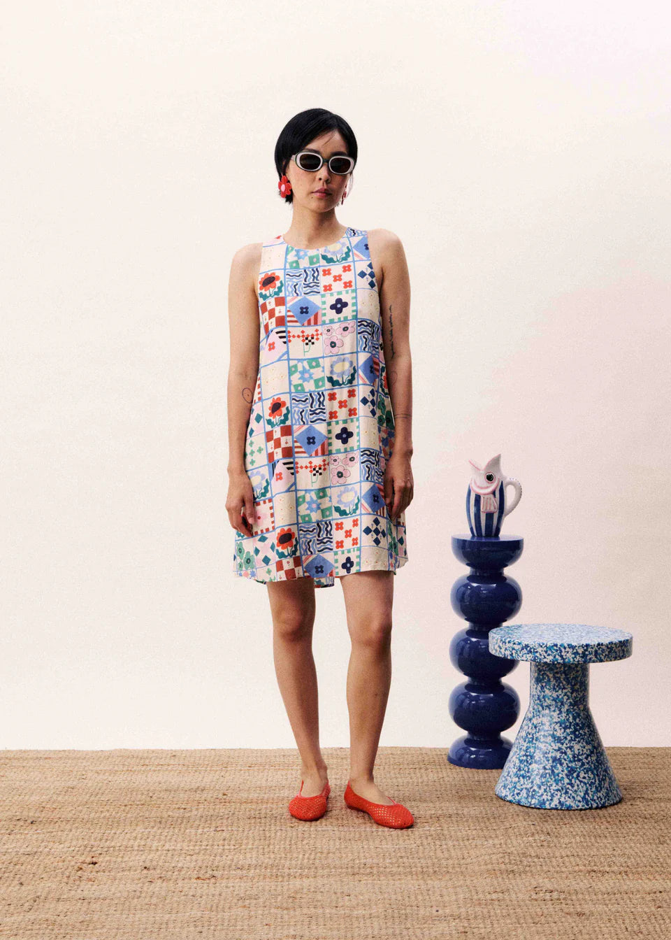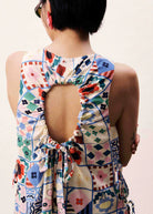 Playful and effortlessly chic, this sleeveless mini dress features a colorful patchwork-inspired print with a mix of florals, geometrics, and whimsical motifs. Designed with a relaxed, swingy silhouette, it has a high neckline and an easy, breezy fit that drapes beautifully. The standout detail is the open back with a gathered cutout and adjustable tie, adding a touch of charm and femininity. A side panel with side ties add a little extra flair! Lightweight and airy, it’s the perfect throw-on piece for sunny days, vacations, and everything in between.