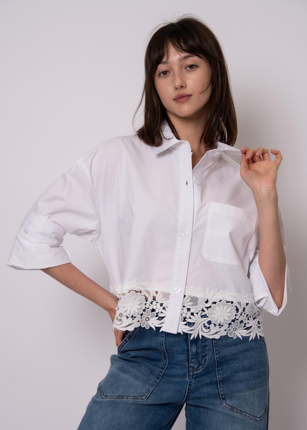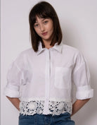 This crisp white button-down blends classic tailoring with feminine detail. Crafted from smooth poplin, the shirt features a relaxed silhouette with a pointed collar, drop shoulders, and a single chest pocket for a timeless, effortless look. The standout detail is the intricate floral lace trim that wraps around the entire hemline, adding a delicate, romantic finish that elevates the clean structure of the shirt. Slightly cropped with uniquely rolled sleeves, it pairs perfectly with denim for an easy polished look or layered over a tank for a modern, feminine touch.