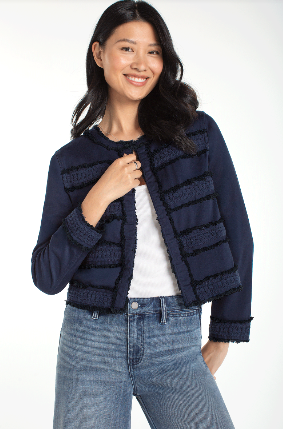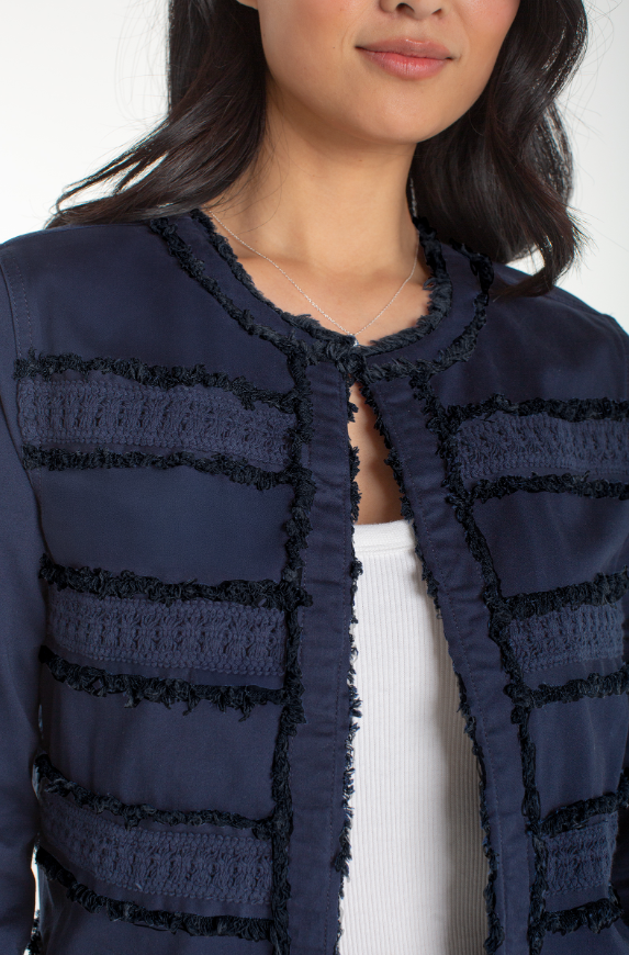 This chic navy jacket blends classic tailoring with modern texture. Designed with subtle hook-and-eye closures, it features tonal horizontal stripe detailing made of embroidered crochet trim and soft frayed edges for a touch of dimension. The round neckline and cropped silhouette create a refined, feminine shape that layers effortlessly over blouses, tees, or dresses. Perfect for polished days or elevated evenings, this piece pairs beautifully with its matching trouser for a sophisticated ensemble or denim for a casual-chic look.