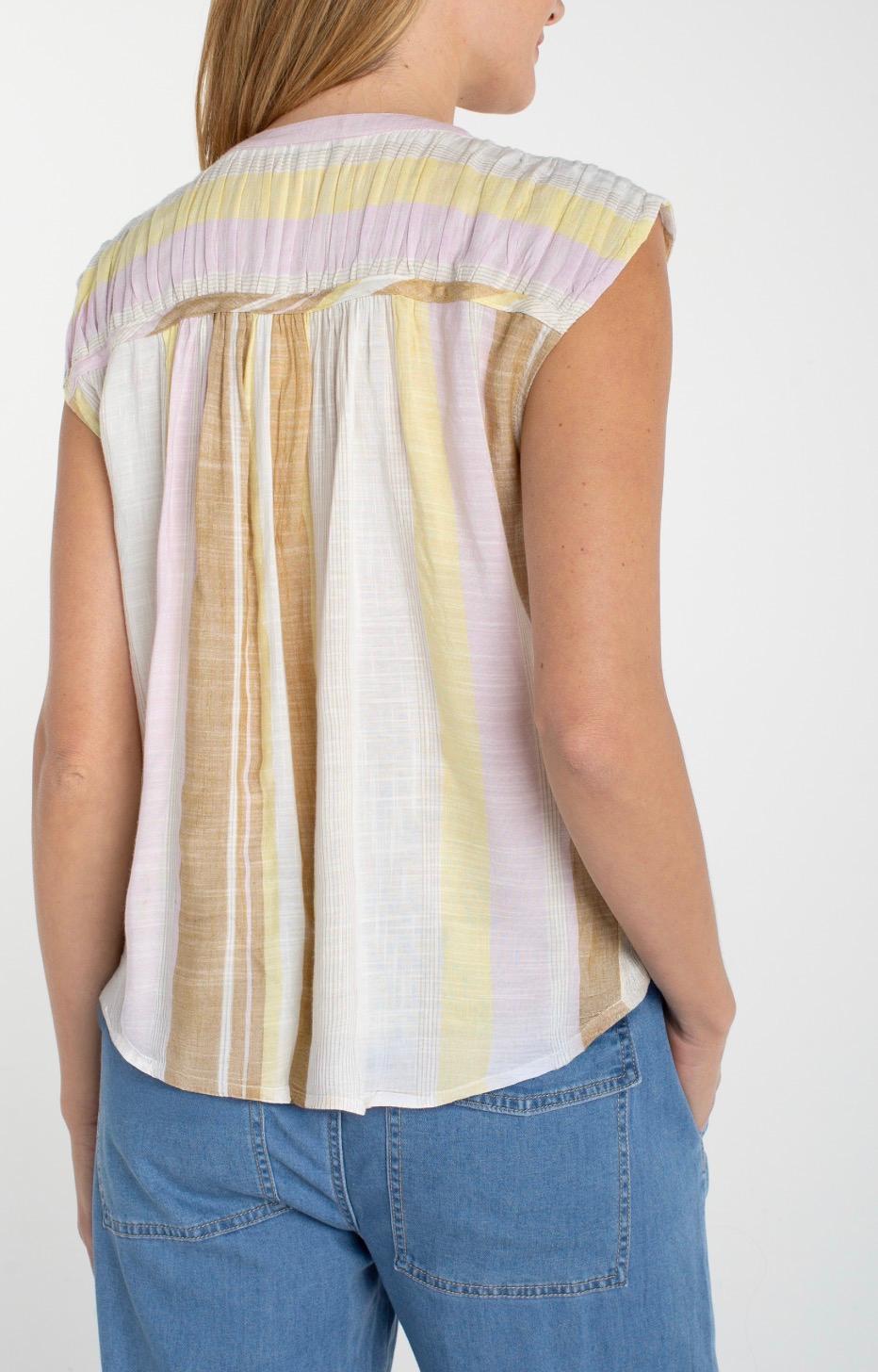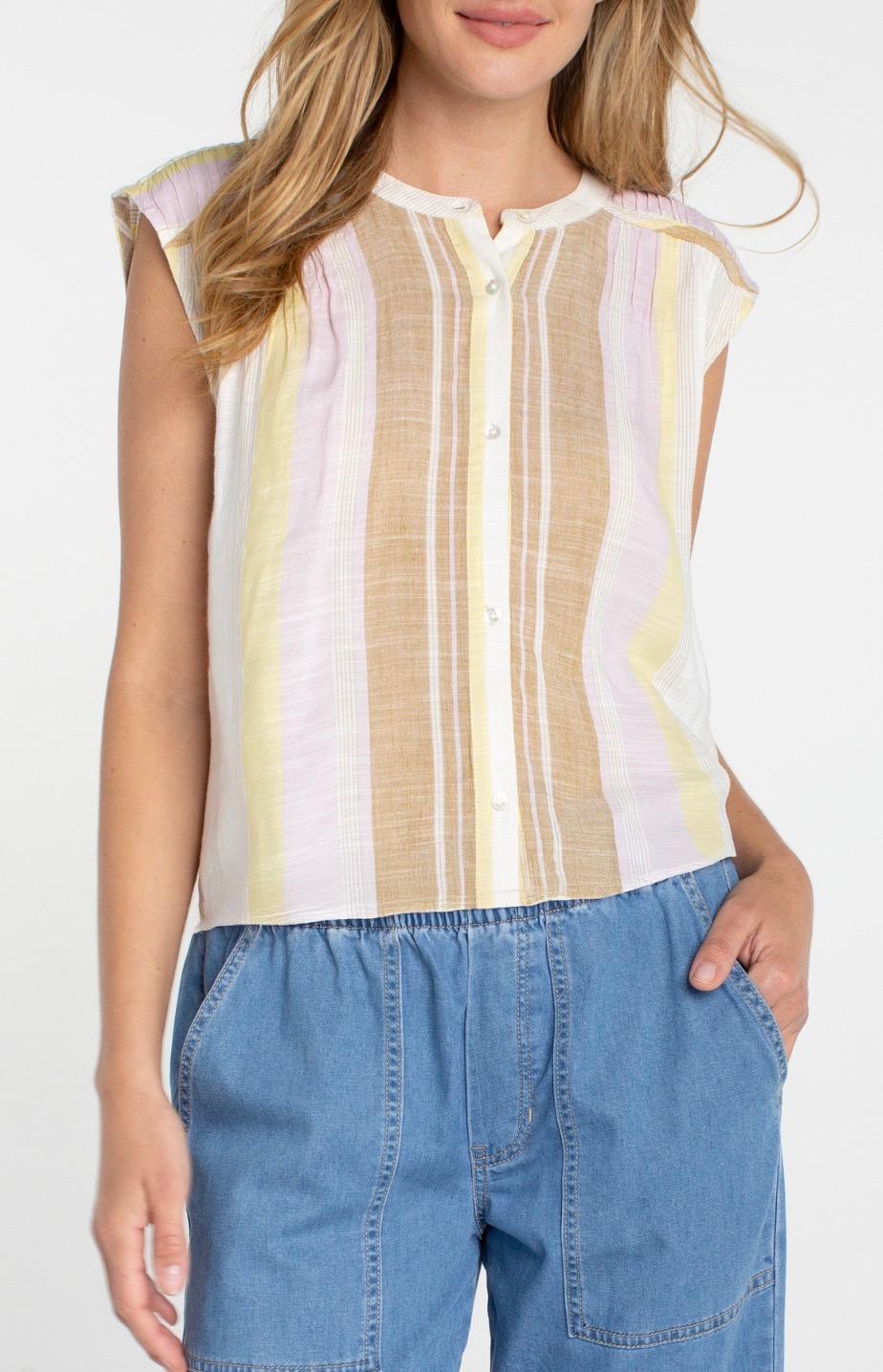Light, airy, and effortlessly feminine — this sleeveless blouse features soft vertical stripes in muted pastel tones of blush, butter yellow, warm sand, and ivory for the perfect spring-to-summer palette. Designed with a relaxed silhouette, it drapes beautifully through the body while subtle gathering along the back yoke and shoulders adds movement and an easy, flowy feel. The cap-style sleeves offer just enough coverage, and the delicate button-front closure keeps the look polished yet approachable. The lightweight woven fabric feels breathable and comfortable, making it ideal for warmer days. Pair it with denim, our utility crop pant, or easy shorts for a fresh, everyday look that feels both elevated and effortless.