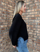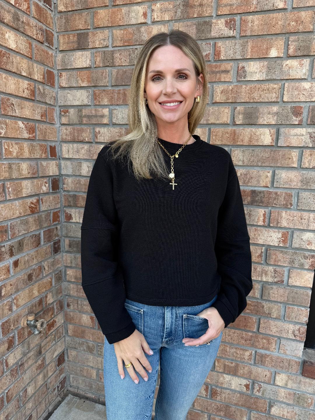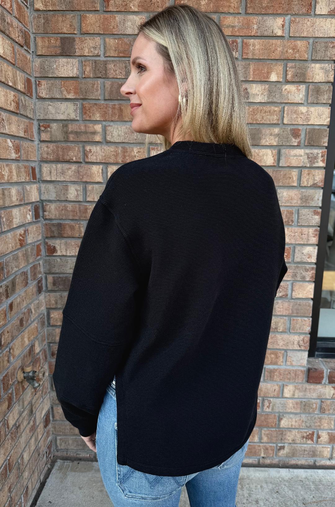 This is a sleek and versatile ribbed knit pullover in classic black. Designed with a crew neckline and a subtle ribbed texture, it offers a modern, polished look while still being casual and comfortable. The silhouette is slightly relaxed with drop shoulders for ease of movement, and the standout detail is the hi-lo hemline—longer in the back and slightly shorter in the front—making it perfect for pairing with both jeans and leggings.