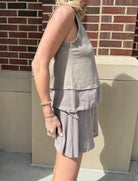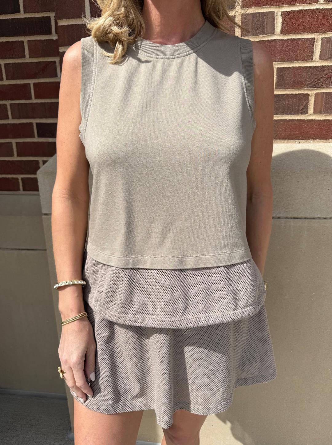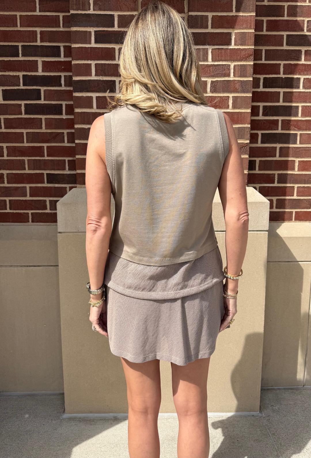 An elevated athleisure tank designed with a clean, modern silhouette and subtle mixed-texture detail. Crafted from a soft, smooth knit, it features a classic crew neckline and sleeveless cut for an easy, flattering fit. A layered mesh hem adds dimension and a sporty edge, while the adjustable drawcord at the hem allows you to cinch it for a more defined shape or wear it loose for a relaxed, effortless look. Style with the matching skort for a cute casual outfit.