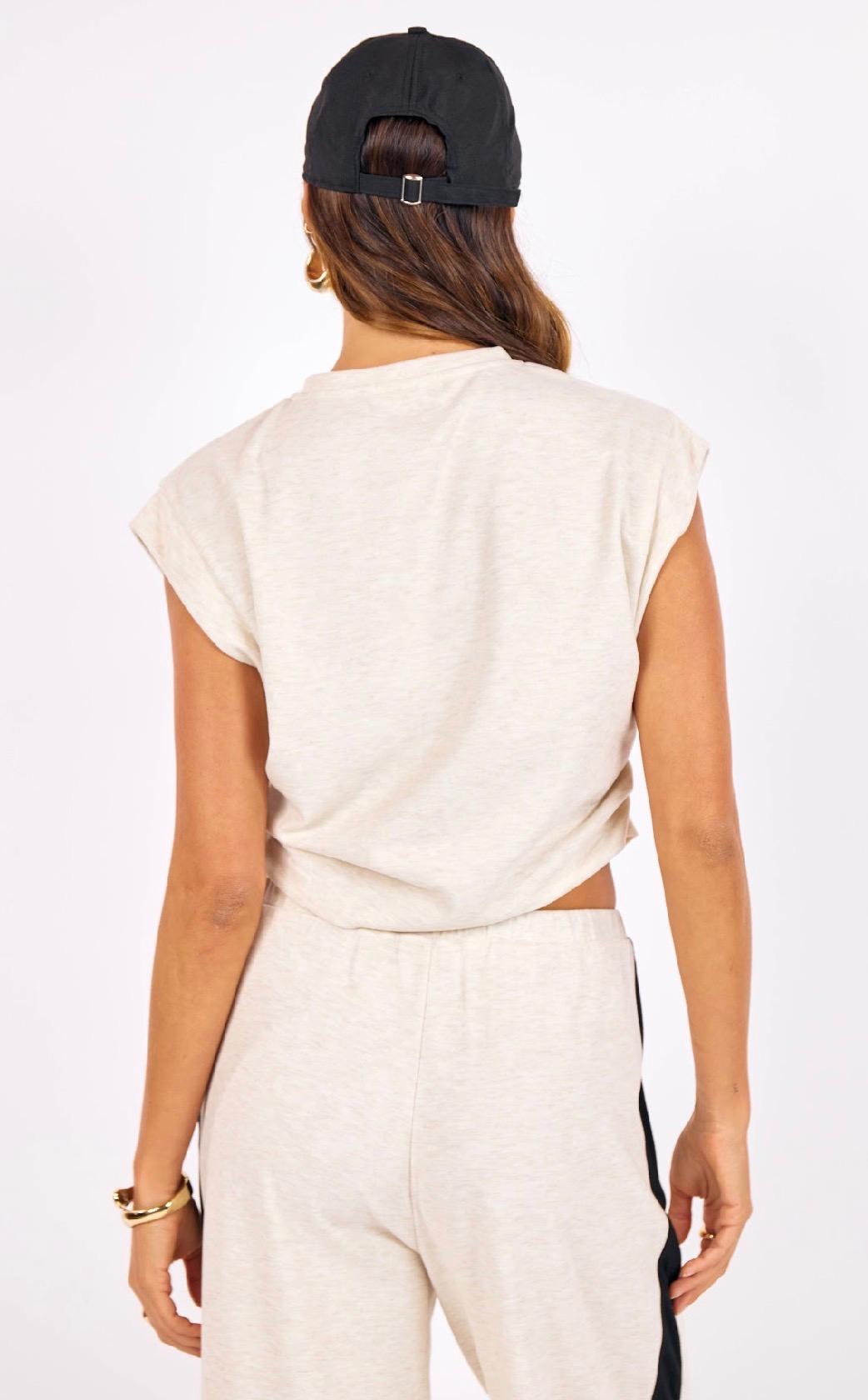 This soft, sleeveless top is designed with an easy, relaxed fit and a smooth, comfortable feel. Featuring a classic crew neckline and subtle cap sleeves, it creates a flattering, slightly structured silhouette. The standout detail is the elastic side ruching. Finished with a cropped hem, this top pairs perfectly with the matching pants or your favorite high-rise denim or even a maxi skirt for an effortless, modern outfit.