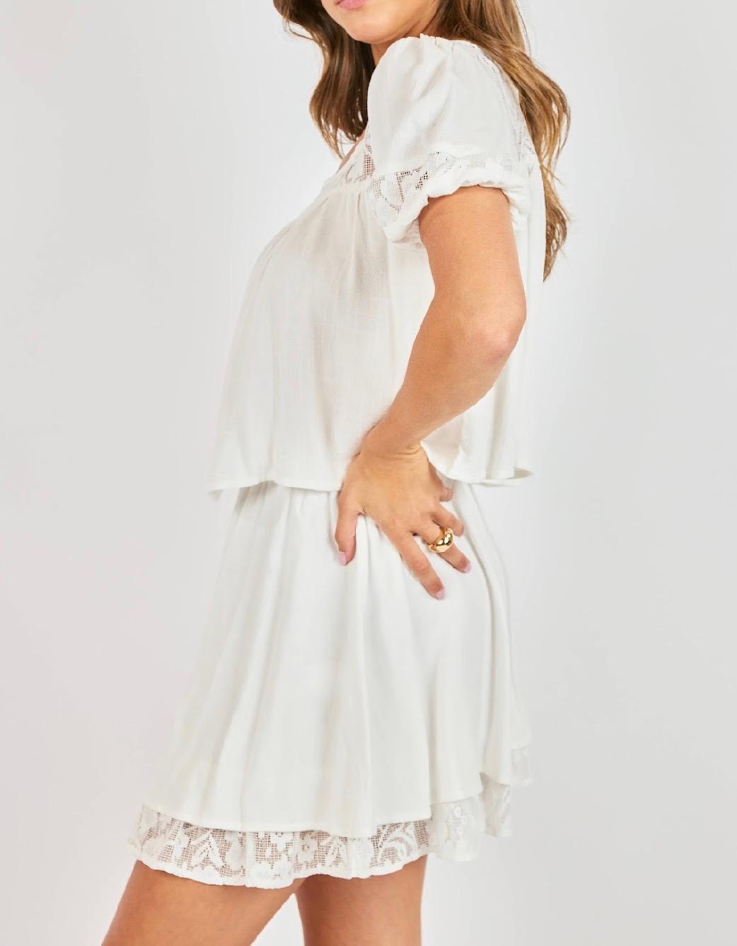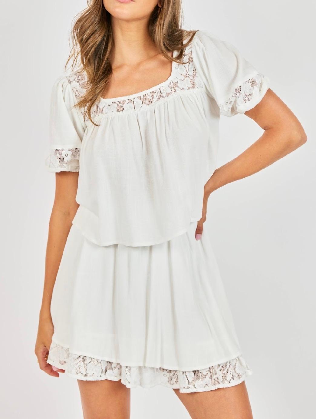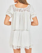 Romantic and effortlessly pretty, this lightweight blouse features delicate lace inset detailing across the neckline and sleeves for a soft, vintage-inspired feel. Designed with a relaxed, flowy silhouette, it drapes beautifully while the subtle puff sleeves add just the right touch of femininity. The airy fabric keeps it breathable and easy to wear, making it perfect for dressing up or down. Style with the matching skirt for an easy, effortless outfit.