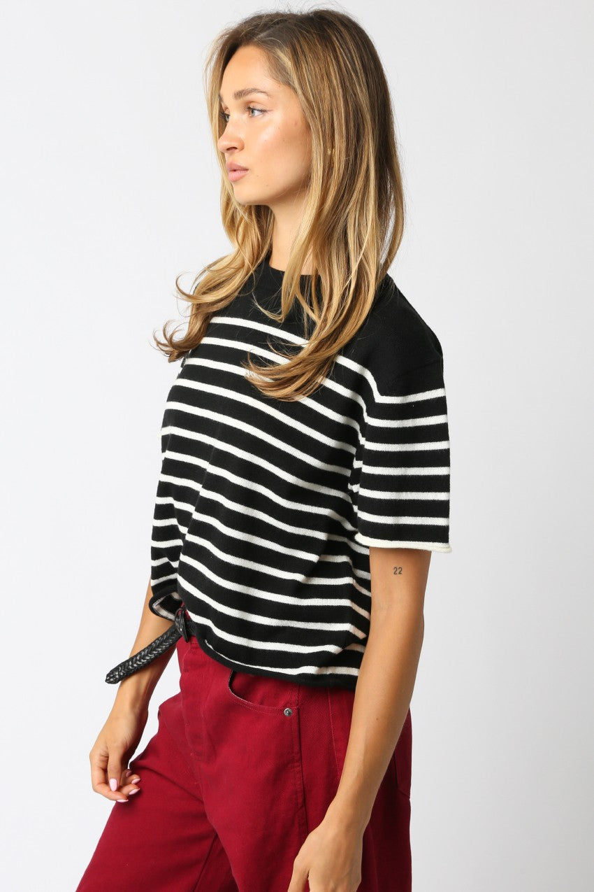 This black and ivory striped knit top is an easy, chic staple for year-round wear. Crafted with a soft and lightweight knit, it features short sleeves, a crew neckline, and a relaxed fit that drapes effortlessly. The horizontal stripe pattern keeps it timeless, while the slightly cropped hem gives it a modern, versatile edge. Perfect for styling casually with denim or shorts, it can also be tucked into trousers or skirts for a polished yet laid-back look. Whether worn solo or layered under a jacket, this knit top is an effortless piece that brings both comfort and style.