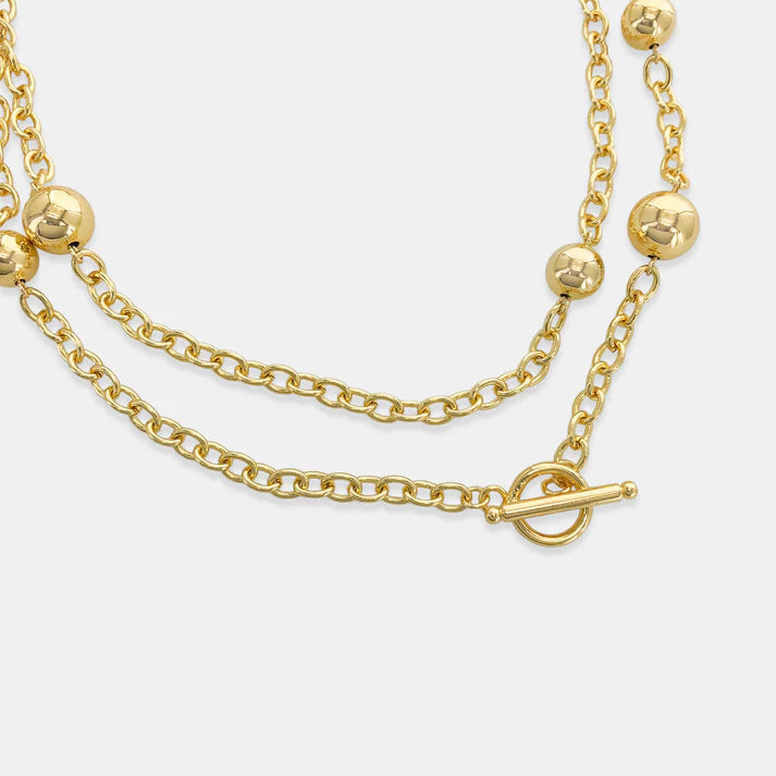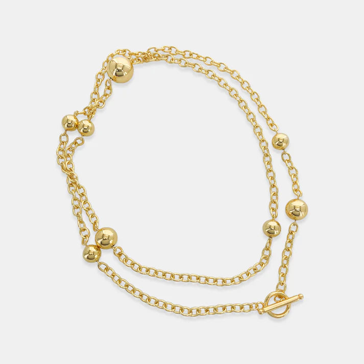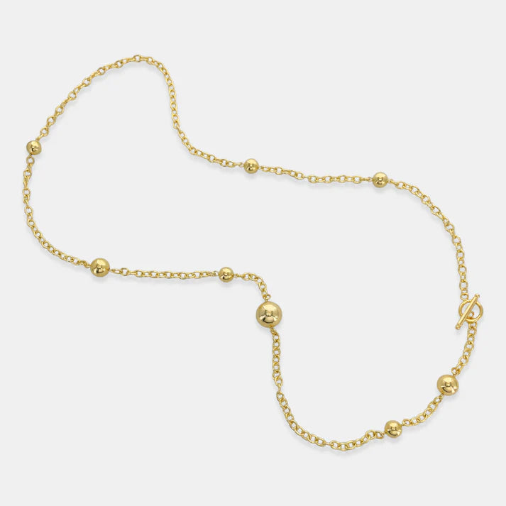 Oval chain necklace with eight spheres throughout the chain and a toggle closure.