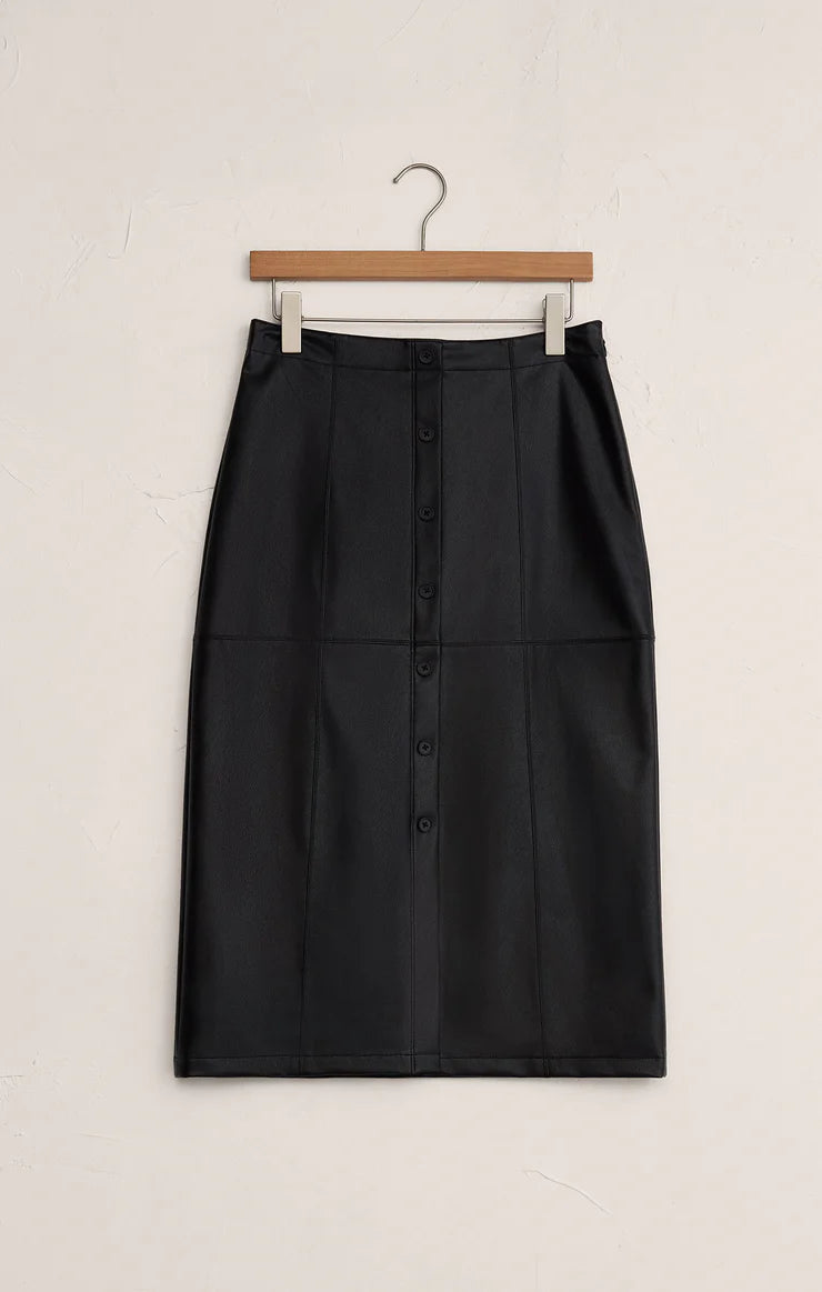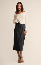 Modern and refined, this faux leather midi is tailored with a high-rise waist and smooth finish that skims the body. The invisible zip closure adds a streamlined edge, while the length makes it ideal for both office polish and weekend cool.