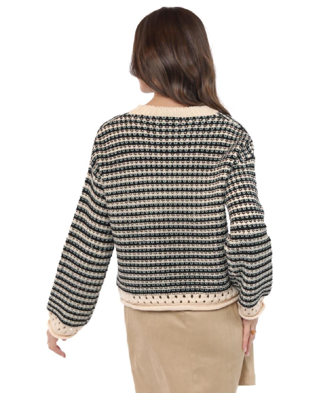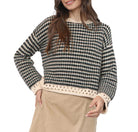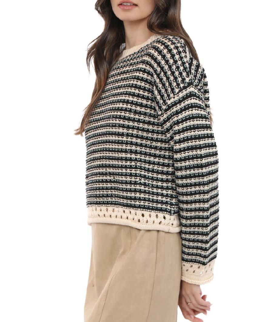 The Samantha Contrast Knit Striped Sweater is a cozy yet chic piece with a unique textured knit. Designed with black, cream and blue horizontal stripes, this sweater features a relaxed fit and slightly dropped shoulders for an easygoing silhouette. The cream ribbed trim at the neckline, cuffs, and hem adds contrast while highlighting the handcrafted feel. Finished with subtle open-knit detailing along the hem and sleeves, it brings a touch of airy charm to its warm, soft structure. Perfect for pairing with denim, skirts, or layering over dresses, this sweater blends everyday comfort with stylish versatility.