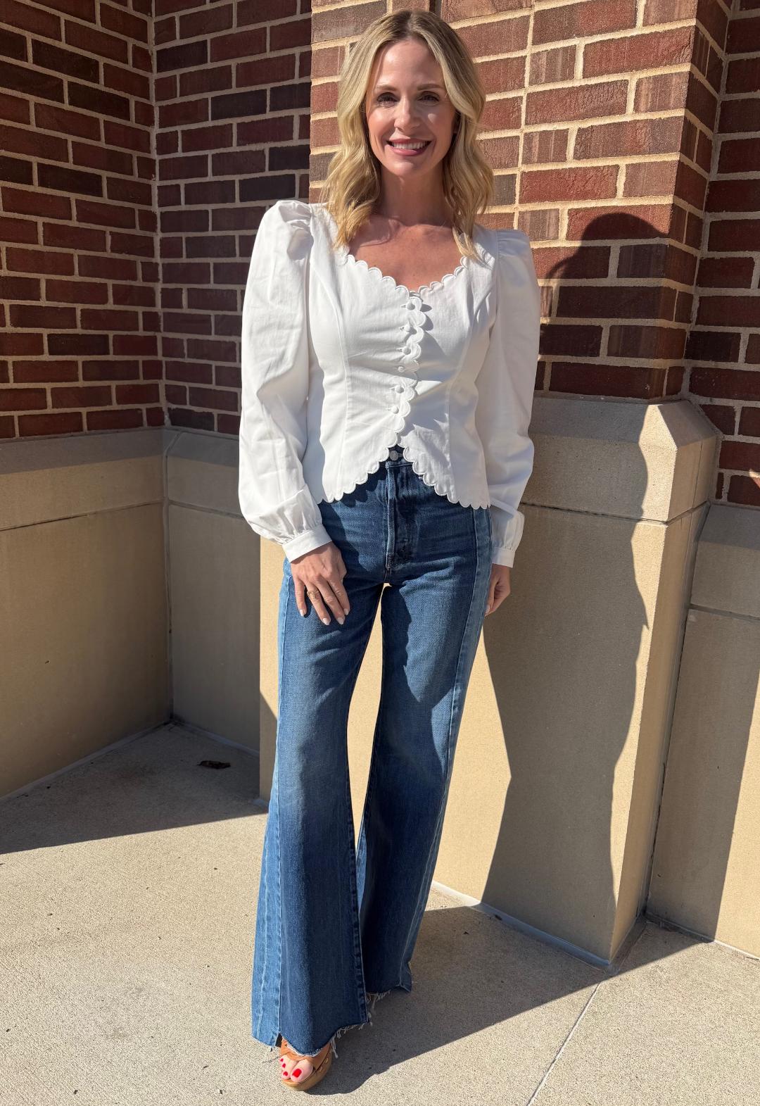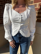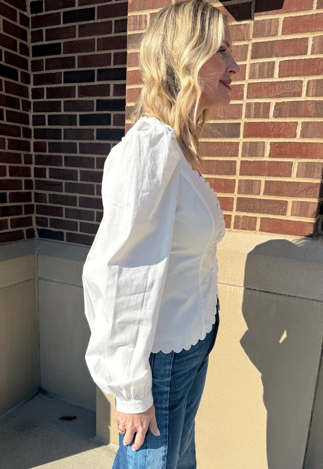 Feminine with just the right amount of structure, this cotton blouse is designed to make a statement while still feeling timeless. Crafted from crisp cotton with a smooth finish, it holds its shape beautifully and gives a polished, tailored look. The scalloped sweetheart neckline and matching scalloped button placket add soft, romantic detail, while covered buttons down the front keep the look cohesive and refined. Subtle front and back seaming create a flattering, lightly fitted silhouette through the waist. The long sleeves feature soft puff shoulders and gentle volume through the arm, finished with a clean cuff for balance. The scalloped hemline mirrors the neckline, giving this piece an extra-special touch from every angle. It’s the perfect elevated white top — stunning with denim for an everyday chic look or dressed up with trousers or a midi skirt for something more polished. Classic, feminine, and effortlessly put together.