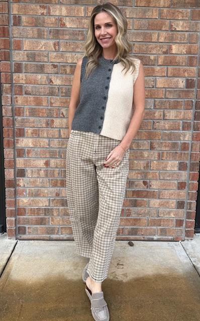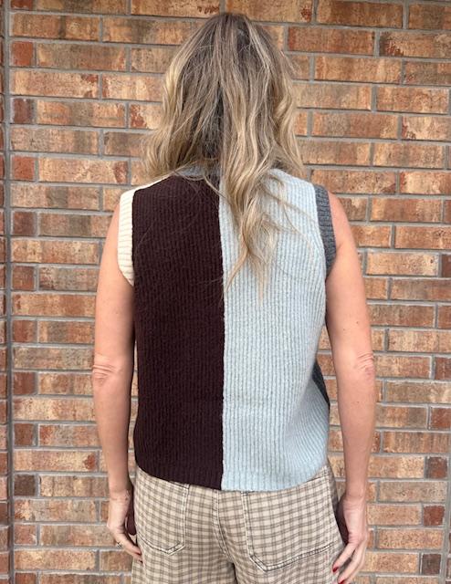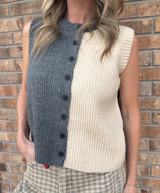 This sleeveless sweater vest brings a modern, artful edge to a classic knit. Designed with a bold vertical colorblock pattern, it features contrasting neutral tones that create visual interest from every angle. The ribbed knit texture adds softness and dimension, while the button-front detail gives it a polished, versatile finish. Lightweight yet cozy, it’s easy to wear on its own during warmer days or layered over a tee or long sleeve as seasons change. Effortlessly cool and slightly unexpected, this piece is perfect for elevating everyday denim or pairing with tailored trousers for a more styled look.