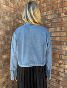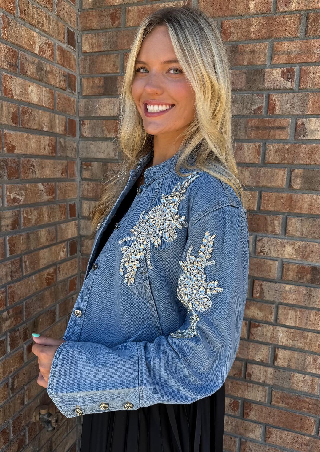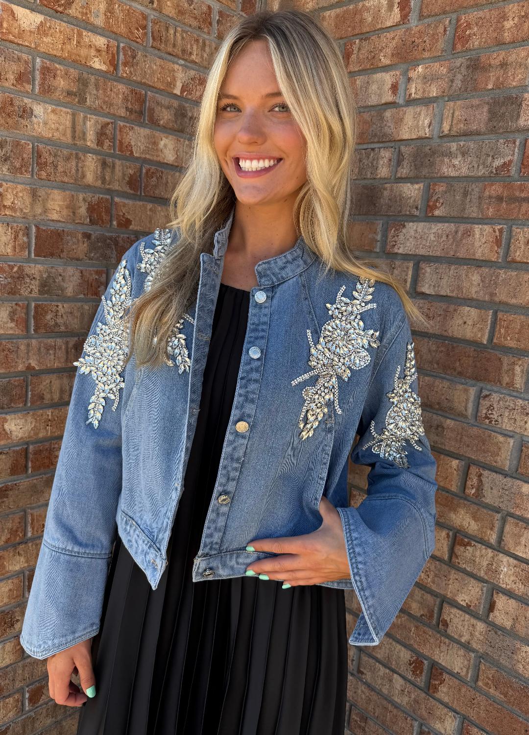 Add a little sparkle to your staples with The Stella Embellished Denim Jacket. This cropped denim layer features a collarless neckline, statement crystal floral embellishments across the shoulders and sleeves, and a relaxed fit with flared cuffs. Perfect over dresses or with your favorite jeans, it’s the denim jacket that brings the drama—in the best way.