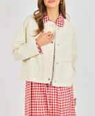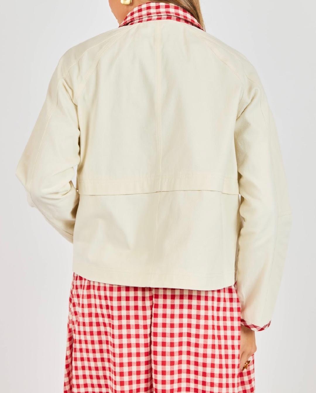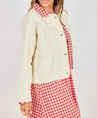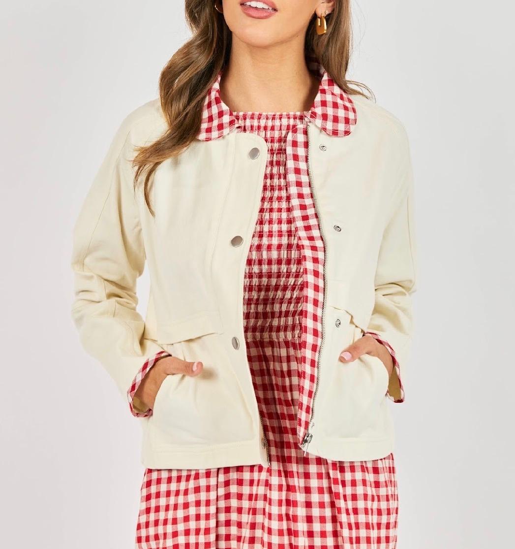 This barn-style jacket is a fresh, charming take on a classic silhouette. Crafted from a smooth, structured fabric, it features a relaxed, easy fit that layers comfortably without feeling bulky. The standout detail is the contrast gingham collar, matching gingham placket and trim at the cuffs, adding a playful pop of pattern against the soft cream body. Designed with snap-front and zip closures, front patch pockets, and clean seam detailing, this jacket feels both practical and polished. A versatile layering piece that brings personality to everyday outfits while remaining timeless and wearable. For a super cute outfit get the coordinating Apple Butter Gingham Pant and Cozy Nest Cap Sleeve Tee.