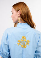 Such a fresh, standout piece for the season. This sky-blue shirt dress features striking golden embroidered floral motifs placed throughout the front and a bold statement embroidery centered on the back. Designed with a soft ruffle stand collar and full button-front closure, it blends classic tailoring with feminine detail. The short puff sleeves are finished with elastic cuffs for a subtle gathered shape, while the relaxed A-line silhouette gives it an easy, flattering drape. And yes — it has side pockets (because we love a dress with pockets). Lightweight and polished yet playful, this one is perfect for brunch, showers, vacation, or any day you want to feel effortlessly put together.