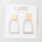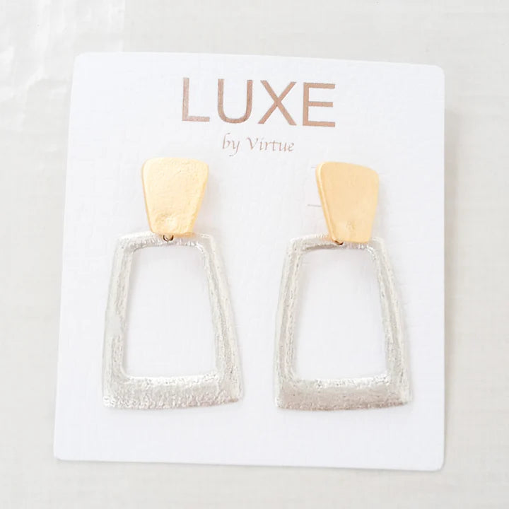 Sleek and sculptural, these geometric drop earrings combine a brushed gold stud with a textured silver open-frame design. Bold, modern, and effortlessly chic.