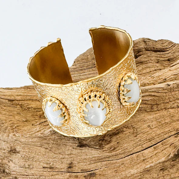 Bold and regal, the Luxe Trinity Cuff features a richly textured gold finish and three luminous stones set in ornate crown-like bezels. A true statement piece with goddess energy.