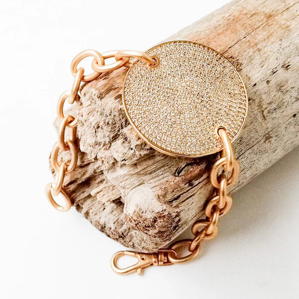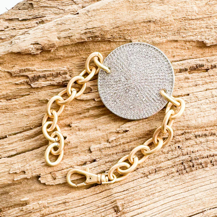 Bold yet refined, this Cable Chain Bracelet features a chunky matte gold link and a dazzling pavé CZ circle disc. A modern classic that adds instant shine to any wrist stack.