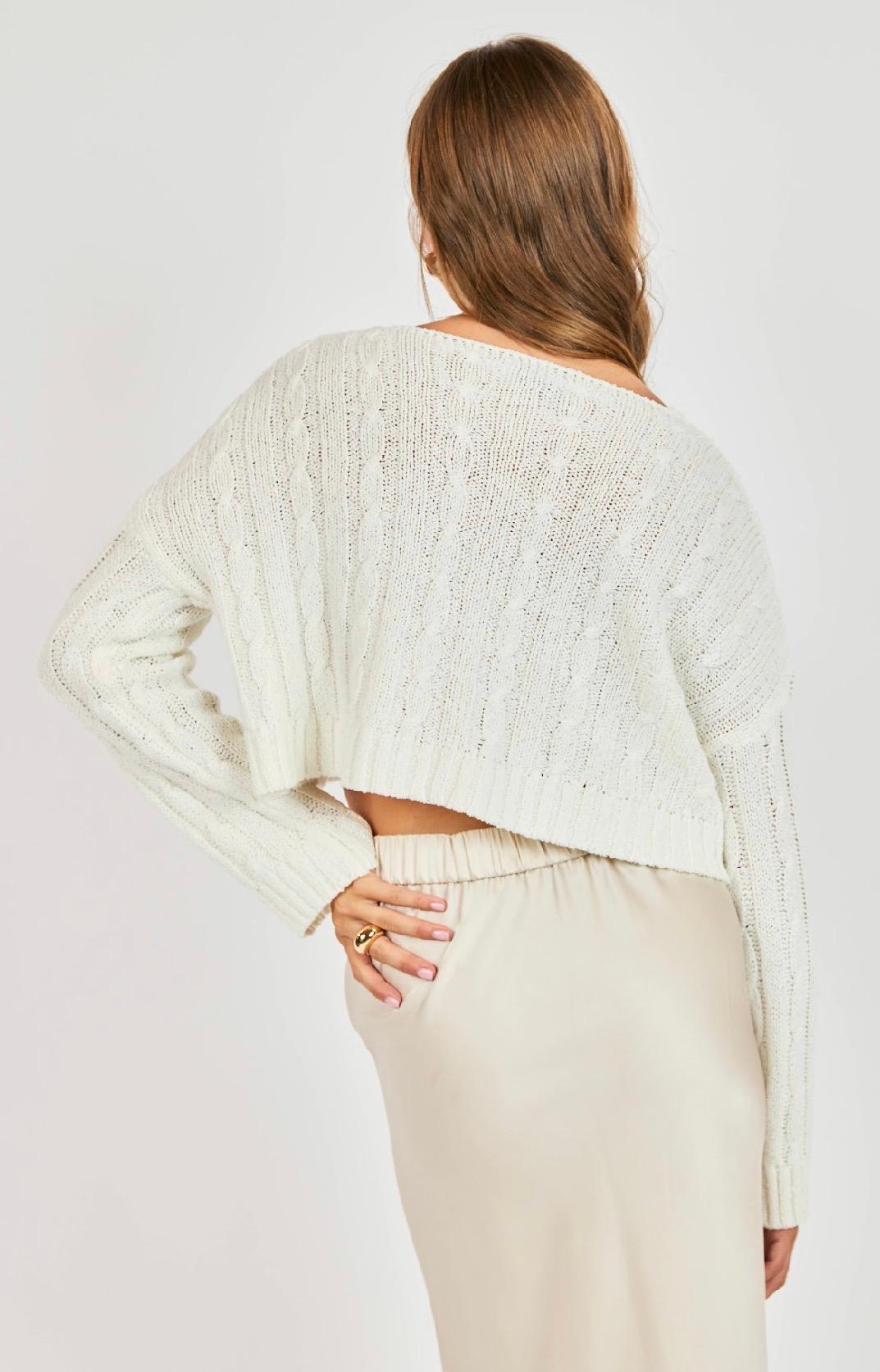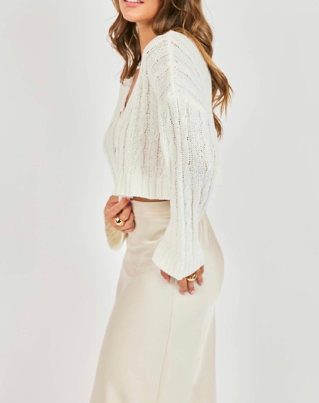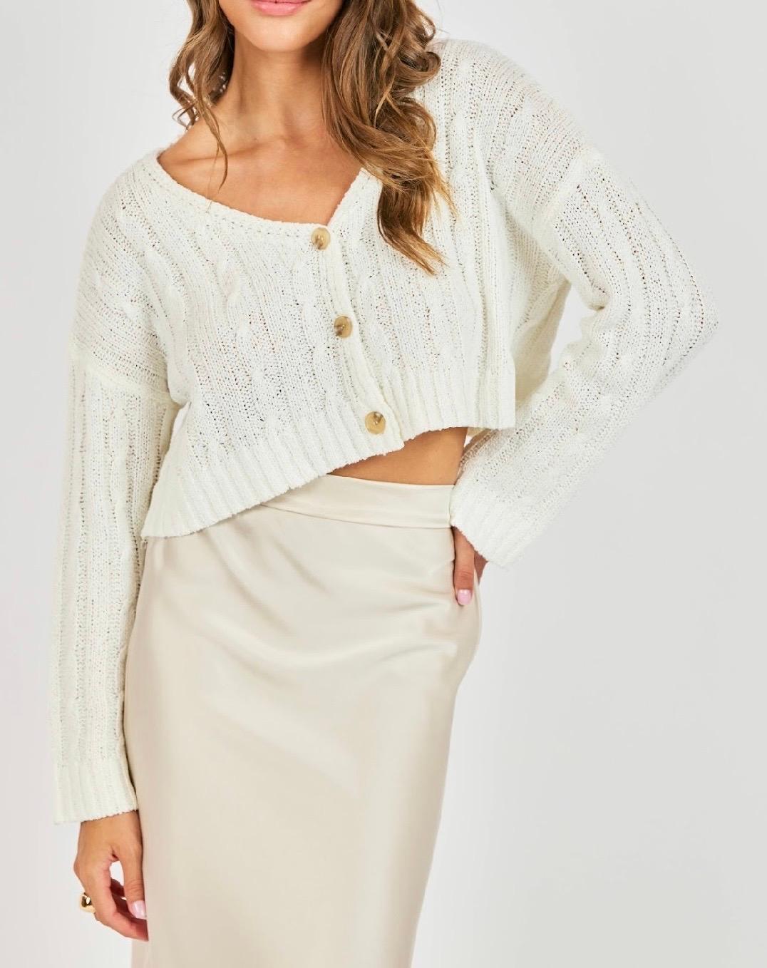 This lightweight spring sweater is the perfect blend of cozy and airy. Crafted in a soft, breathable knit, it features delicate pointelle and subtle cable detailing that add texture without feeling heavy. The cropped silhouette gives it a modern, flattering shape, while the relaxed fit keeps it easy and effortless. Designed with a soft scooped V neckline and statement tortoise-style buttons down the front, it can be worn buttoned up as a top or styled open over a tank or dress. The long sleeves are slightly relaxed with ribbed cuffs and hem for gentle structure. In a fresh, white neutral, it’s an easy layering piece to transition from cool mornings into warmer afternoons all spring and summer long!