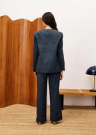 The Frnch Grisette Tie Front Blazer is a modern reimagination of the classic pinstripe jacket. Designed in a dark charcoal hue with thin vertical blue and burgundy stripes, it creates a sleek, elongating silhouette. Instead of traditional buttons, it features unique tie-front closures that add a contemporary, slightly undone edge. The structured shoulders and clean lines balance the playful detail, making it versatile for both polished office looks and more fashion-forward styling. Style with the matching trouser for a chic head-to-toe look or mix it up with denim or other trousers.