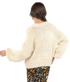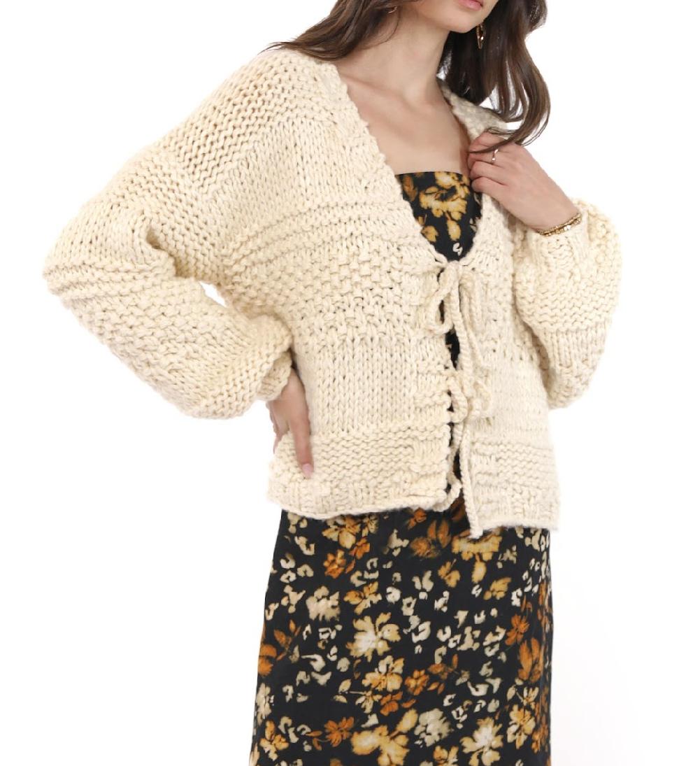 Cozy up in artisanal charm with this ivory hand-knit cardigan. Designed with a chunky textured knit, it features a relaxed silhouette, voluminous sleeves, and unique front tie closures for a laid-back yet feminine feel. Its versatile ivory shade makes it easy to layer over dresses, denim, or lounge looks, while the hand-knit detailing adds a touch of one-of-a-kind craftsmanship.