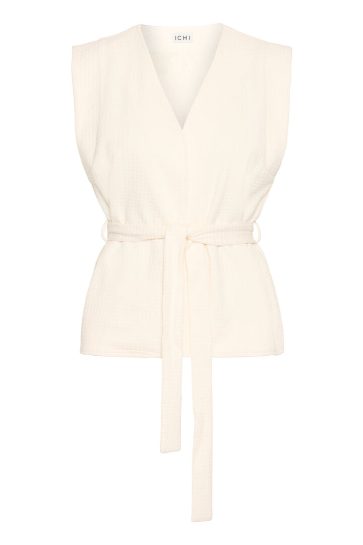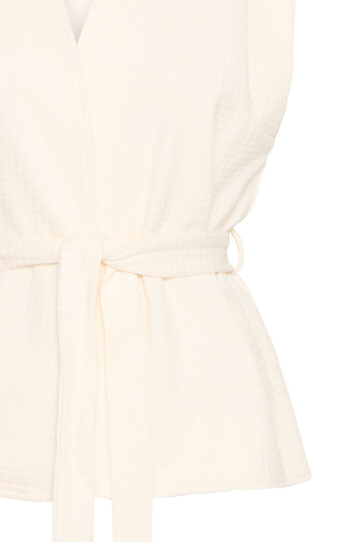 This wrap vest is made from a soft, textured fabric in a cream color. A flattering v-neckline and open front design with a tie at the waist allows for a customizable fit. A chic, minimalist look when paired with the matching pant. Perfect for layering or wearing on its own.