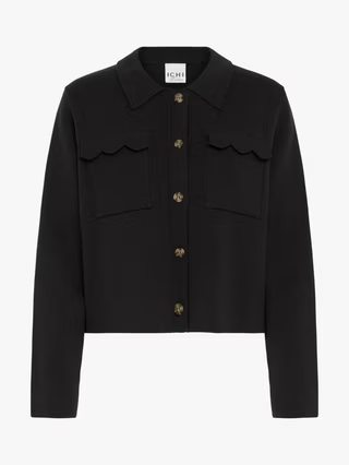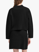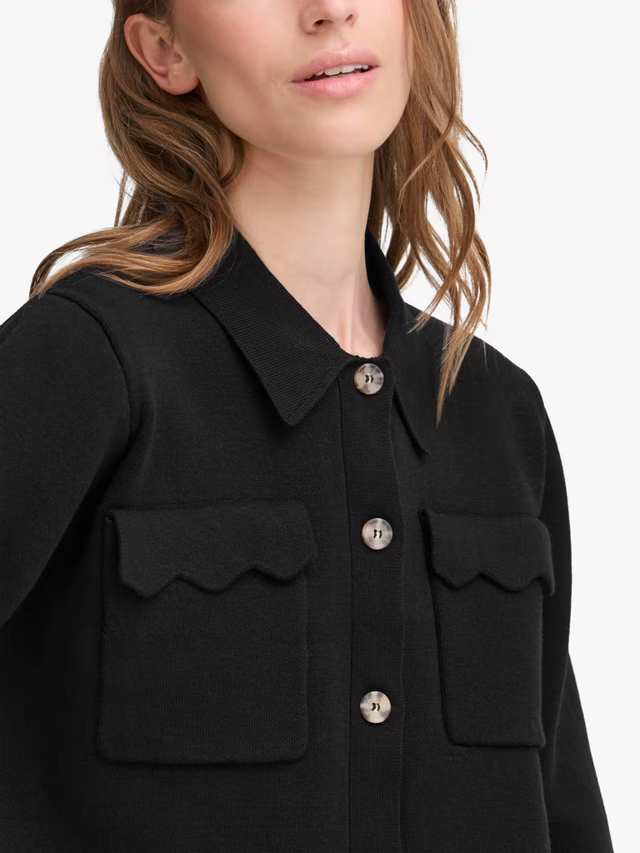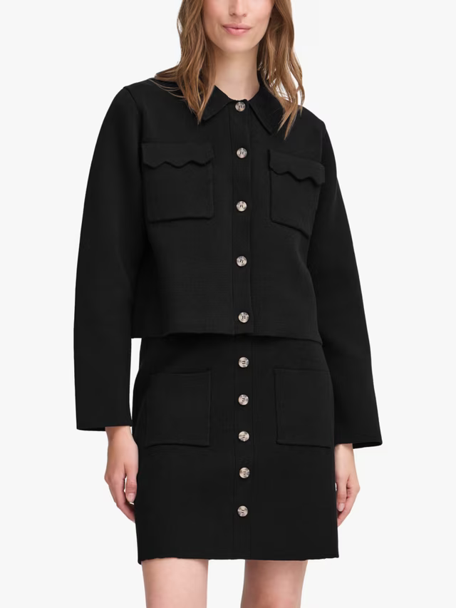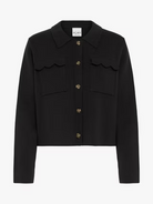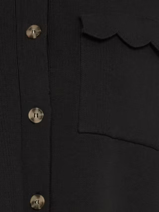 The knit cardigan top is crafted in a tightly woven, medium-weight soft knit that feels smooth and substantial against the skin. It features a classic button-front closure, long sleeves, and a slightly boxy fit that makes it easy to layer or wear alone. The structure of the knit gives it a refined finish, making it versatile enough for both casual styling and elevated looks. Polished off with front chest pockets that feature a scalloped flap. For a chic set, get the matching skirt HERE.