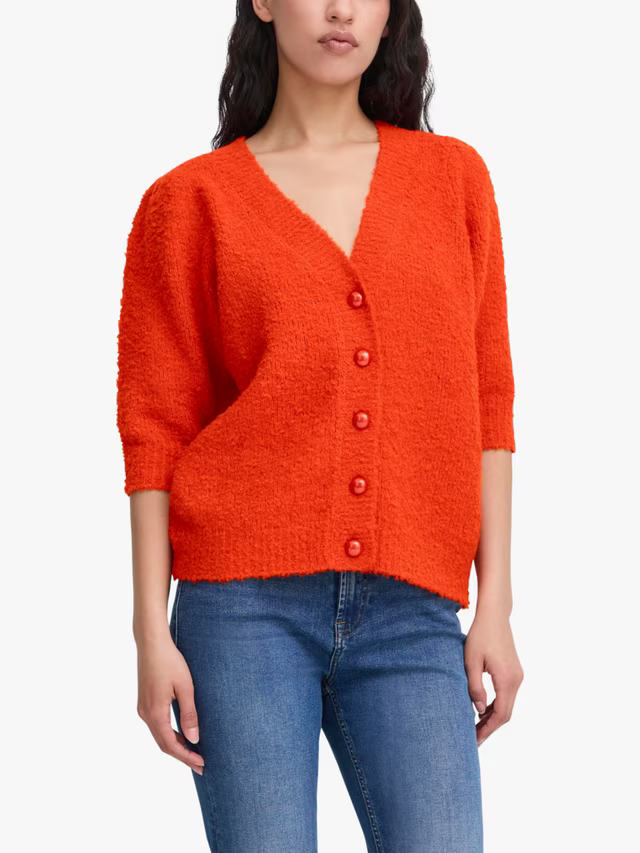 This 3/4 sleeve sweater cardigan is a vibrant layering piece in a rich tangerine hue that instantly brightens up any look. Designed with a relaxed, boxy silhouette, it features a soft knit texture that makes it cozy yet breathable. The short, wide sleeves give it a modern, easygoing shape, while the button-front closure adds versatility—wear it open as a light layer or buttoned as a top. Its length makes it perfect to style with high-waisted denim, skirts, or trousers, and the bold color provides a fun pop for both casual and dressed-up outfits. A playful yet chic cardigan that transitions seamlessly between seasons.