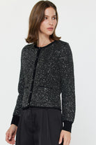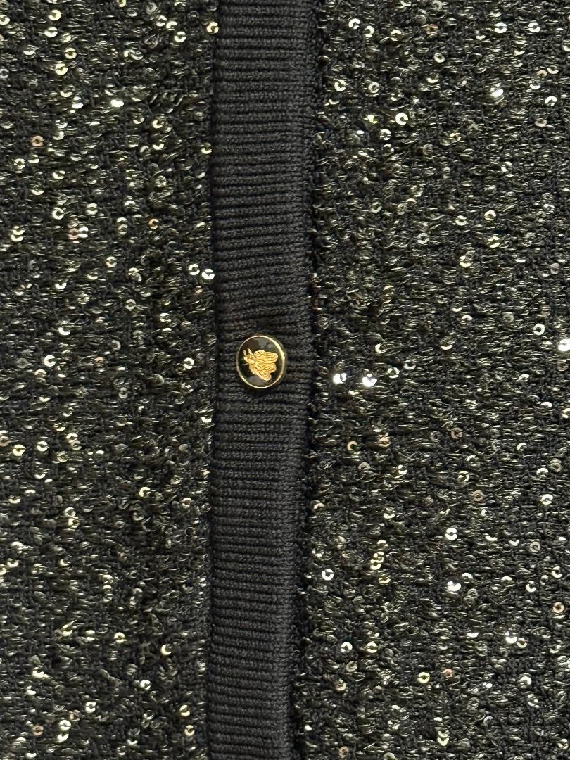 A classic silhouette gets a glamorous upgrade with this shimmering black cardigan, fully embellished with silver sequins that glisten with every movement. Designed with ribbed trim and front pockets, it’s finished with luxe gold bee-engraved buttons — a whimsical yet sophisticated detail that sets it apart. Whether paired with our silky trousers for evening polish or styled with denim for chic daytime sparkle, this cardigan makes a statement that feels both timeless and fresh.