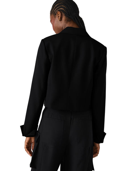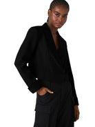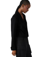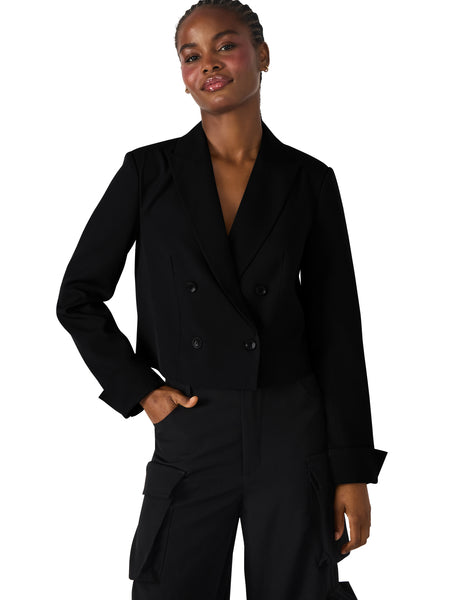 The classic blazer, reimagined. The Rowane Blazer brings a bold, modern twist with its cropped silhouette, double-breasted front, and sharp tailoring. Whether you're layering it over a dress, pairing it with trousers, or rocking it with denim—this versatile black blazer is the wardrobe essential that effortlessly elevates any look. Shown with the Duo Pant.