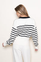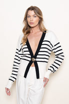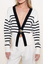 A statement in simplicity. The Sculpted Stripe Muse Cardigan features a bold deep V-neckline, dramatic split hem, and sculptural gold accent button for a modern, artful touch. Designed with a flattering ribbed waist and soft knit fabric, it’s the perfect layer to elevate your wardrobe. Available in solid neutrals and a chic black-and-white stripe, this piece takes you seamlessly from desk to dinner all season long. Wear solo or style over your favorite staples.