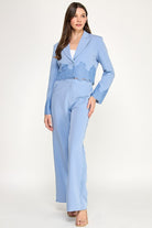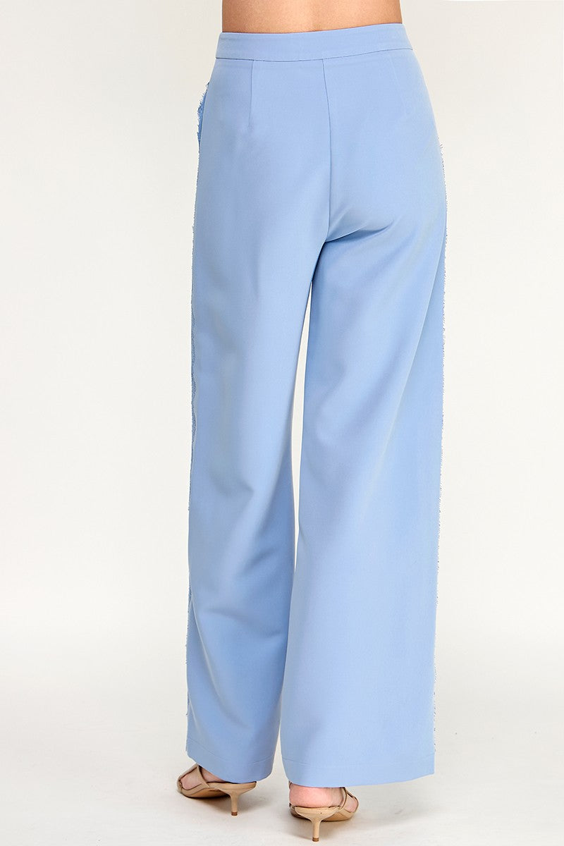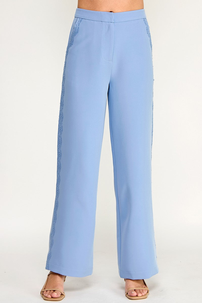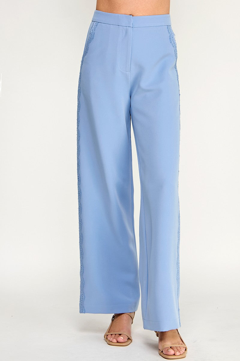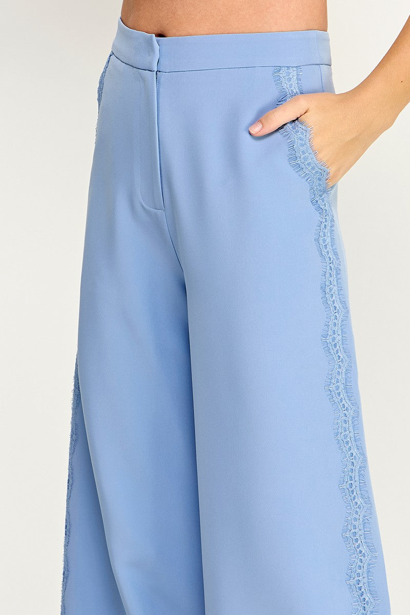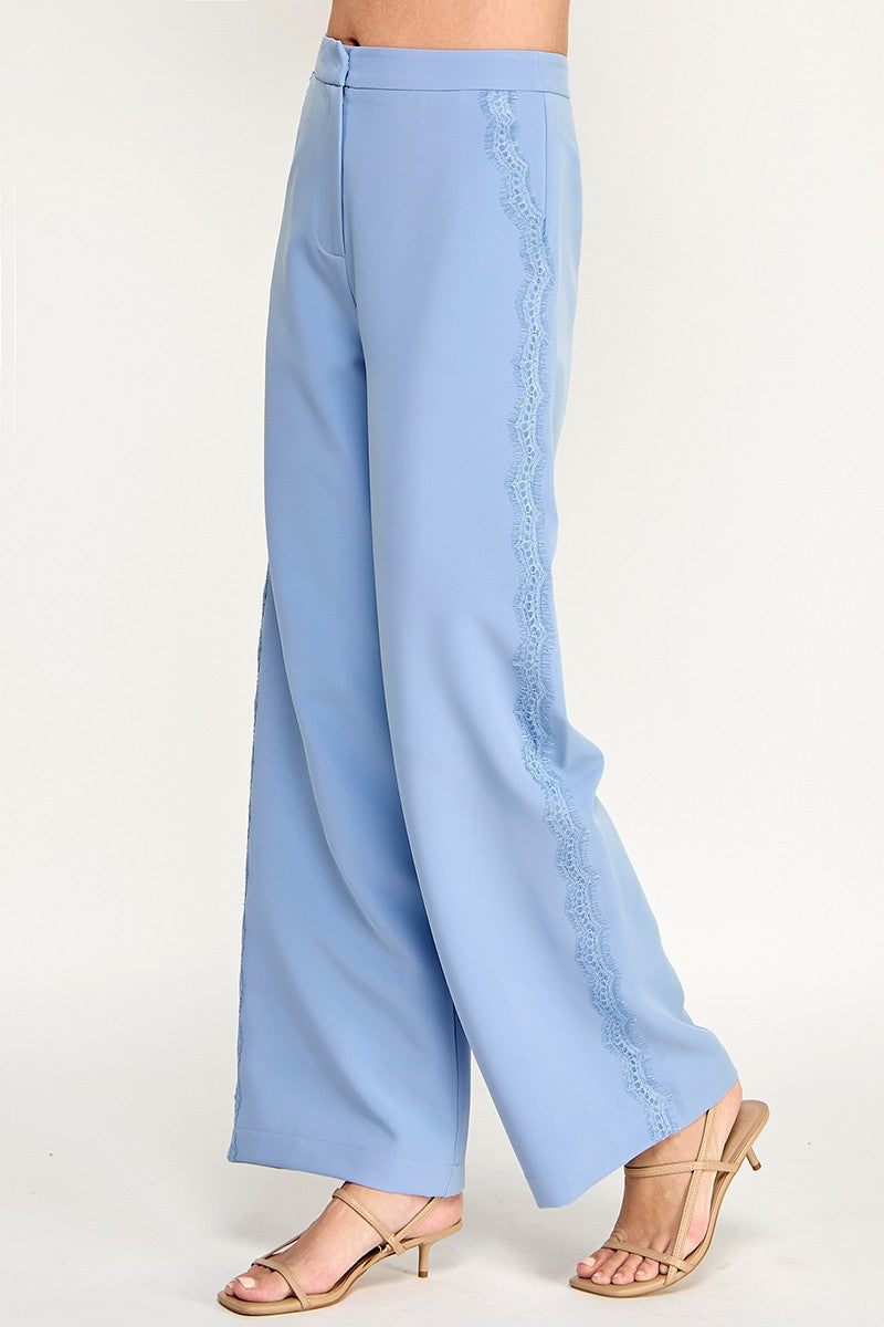 These high-rise wide-leg trousers combine tailored polish with soft, romantic detail. Crafted from a smooth, structured woven fabric, they feature elegant lace trim running down the side seams for a subtle yet striking accent. The clean waistband and flattering drape create a streamlined silhouette that moves effortlessly. Finished with a full-length hem, these pants are equally suited for work, events, or elevated everyday styling—especially when paired with the matching blazer.